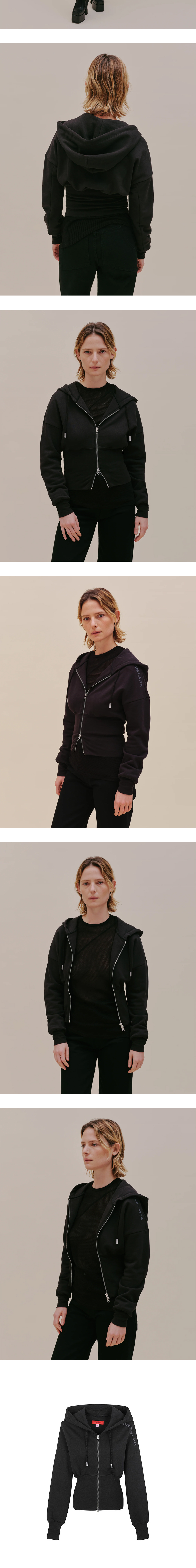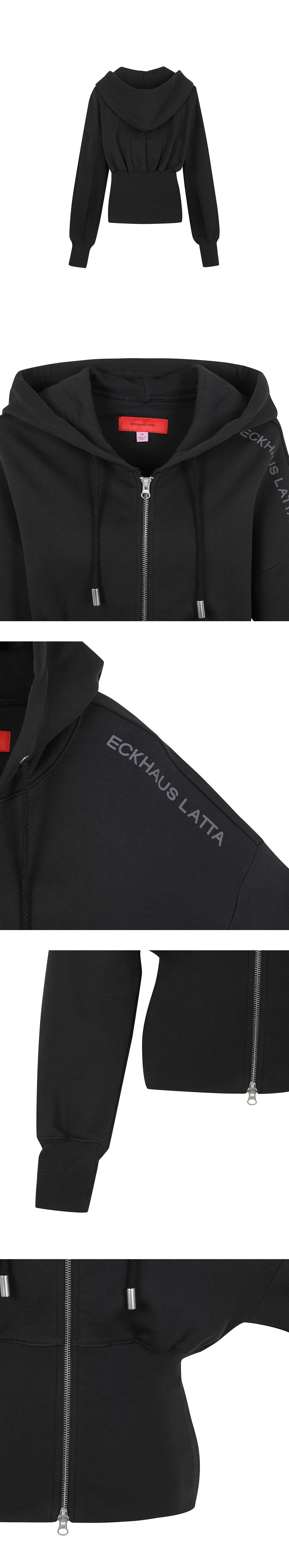 여유로운 실루엣을 잡아주는 과감한 밴딩으로 허리를 부각시킬 수 있는 에크하우스 라타의 후드 집업입니다. - 허리를 핏하게 잡아주는, 과장된 밑단 밴딩 - 브러시드 프렌치 테리 소재 - 좌측 어깨 로고 스크린프린팅 - 블랙 컬러 가먼트 워싱 - 전면 투웨이 지퍼 클로징