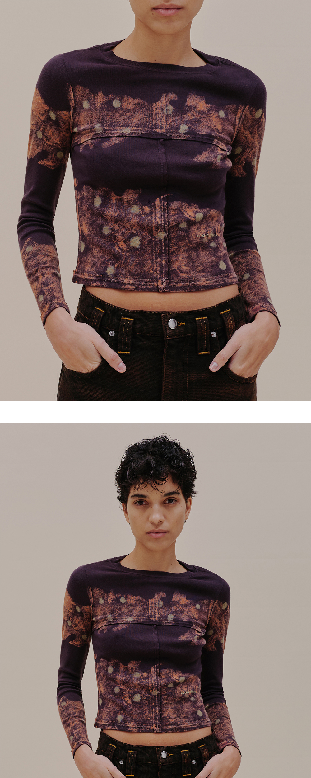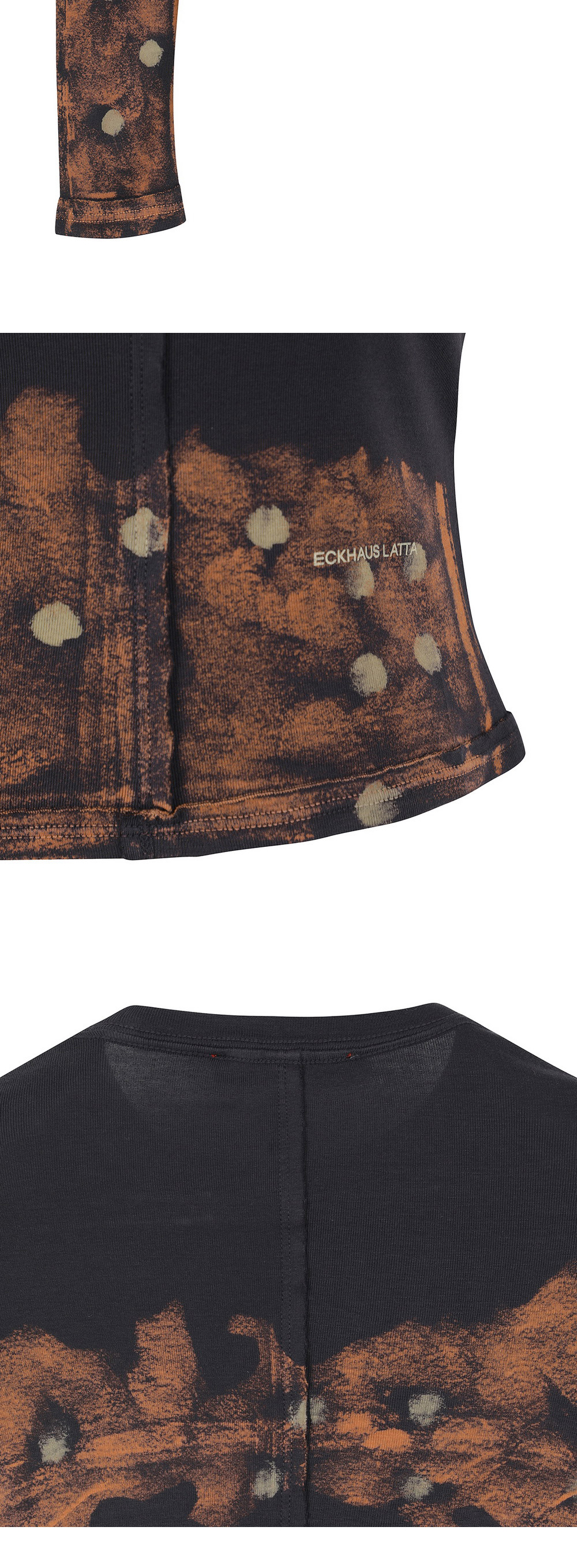 독특한 패턴과 러프한 마감으로 이너 포인트를 줄 수 있는 에크하우스 라타의 크루넥 티셔츠입니다. - 핏한 실루엣 - 약간 크롭한 기장 - 전면 좌측 로고 스크린 프린팅 - 수작업으로 진행된, 꽃을 연상시키는 스프레이 염색 - 러프한 마감의 심 디테일