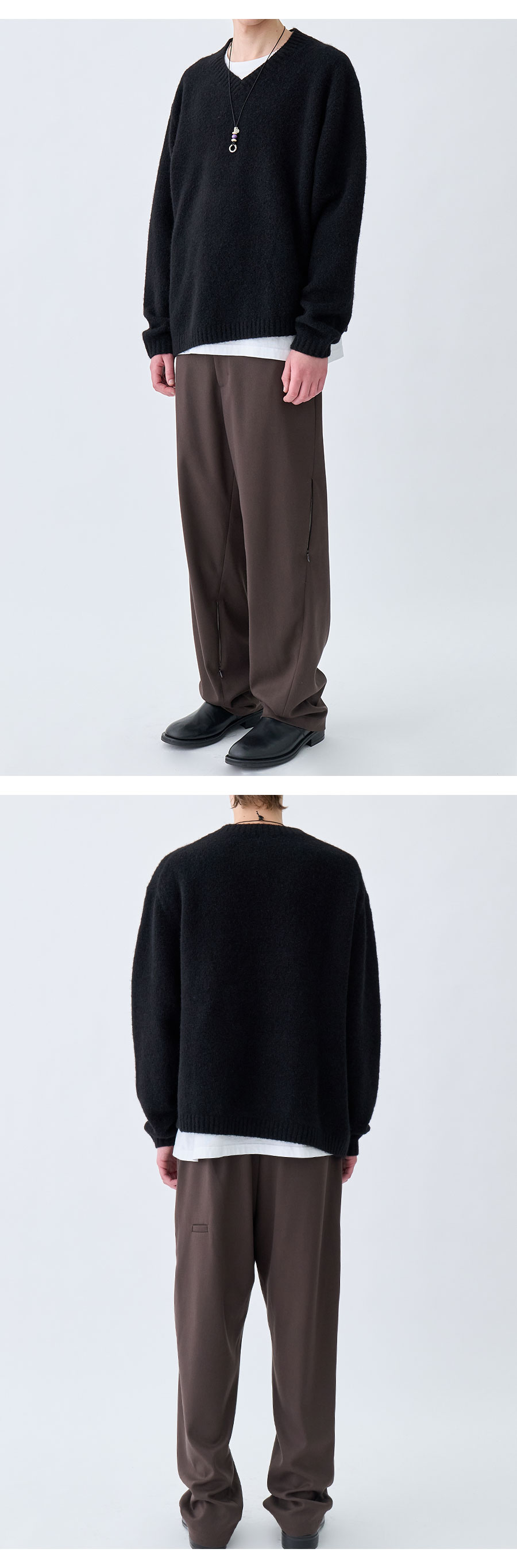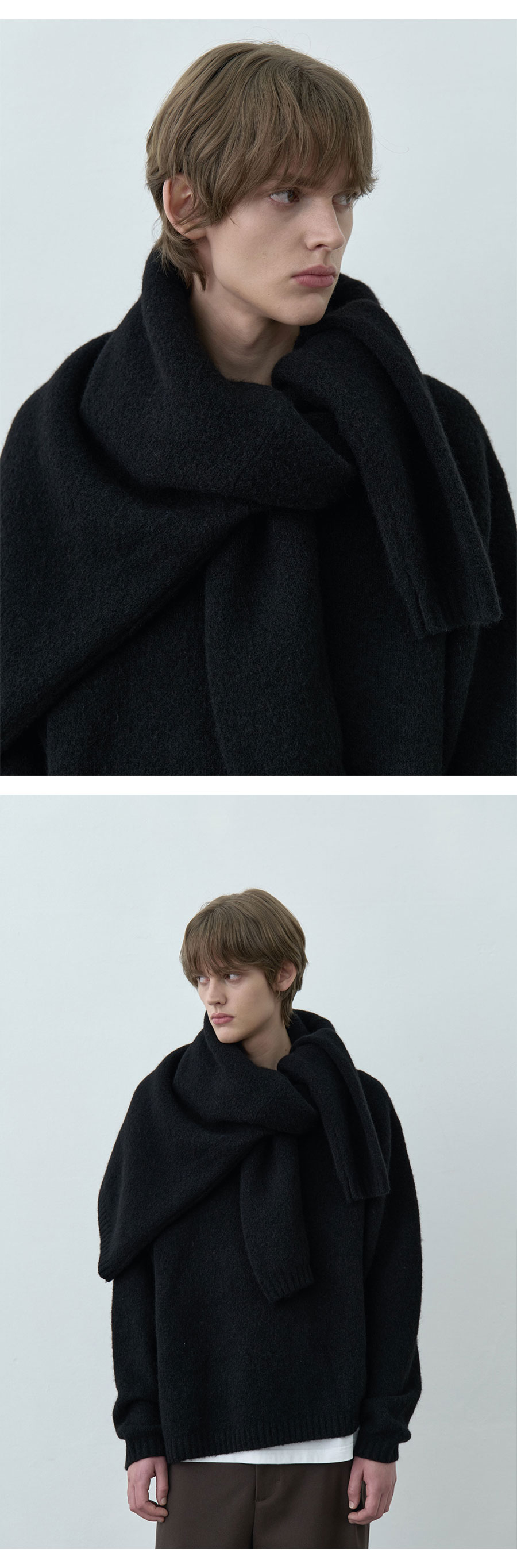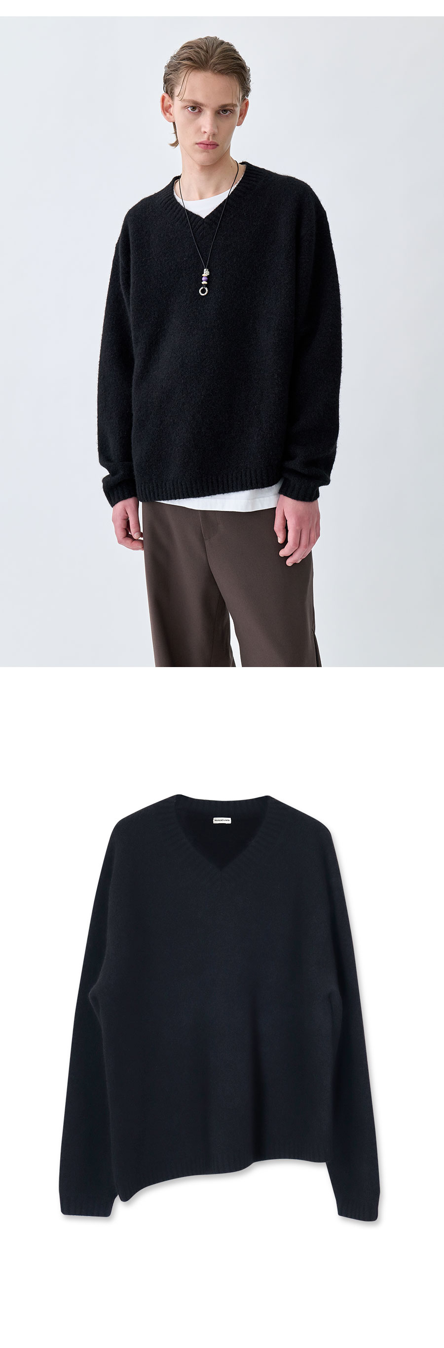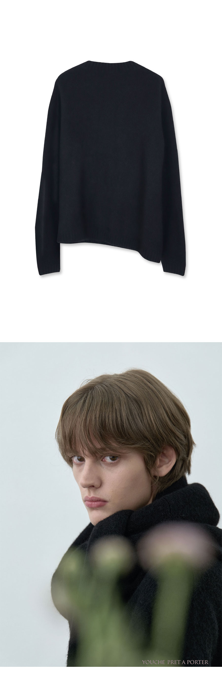 Material Outshell : Alpaca 32% Wool 32% Nylon 30% Spandex 6% Colour : Black - Oblique hem cutting detail - Relaxed Fit - Semi V-neck line - Hairy alpaca fabric - 알파카 소재로 제직된 비대칭 니트
