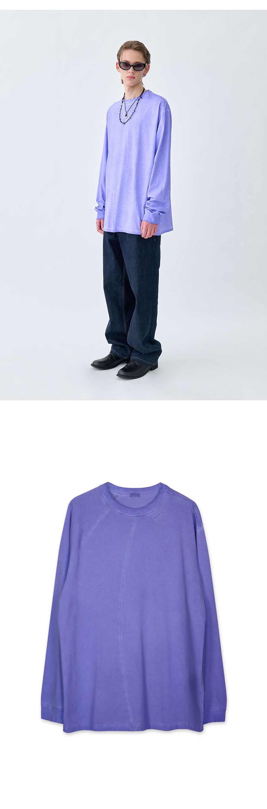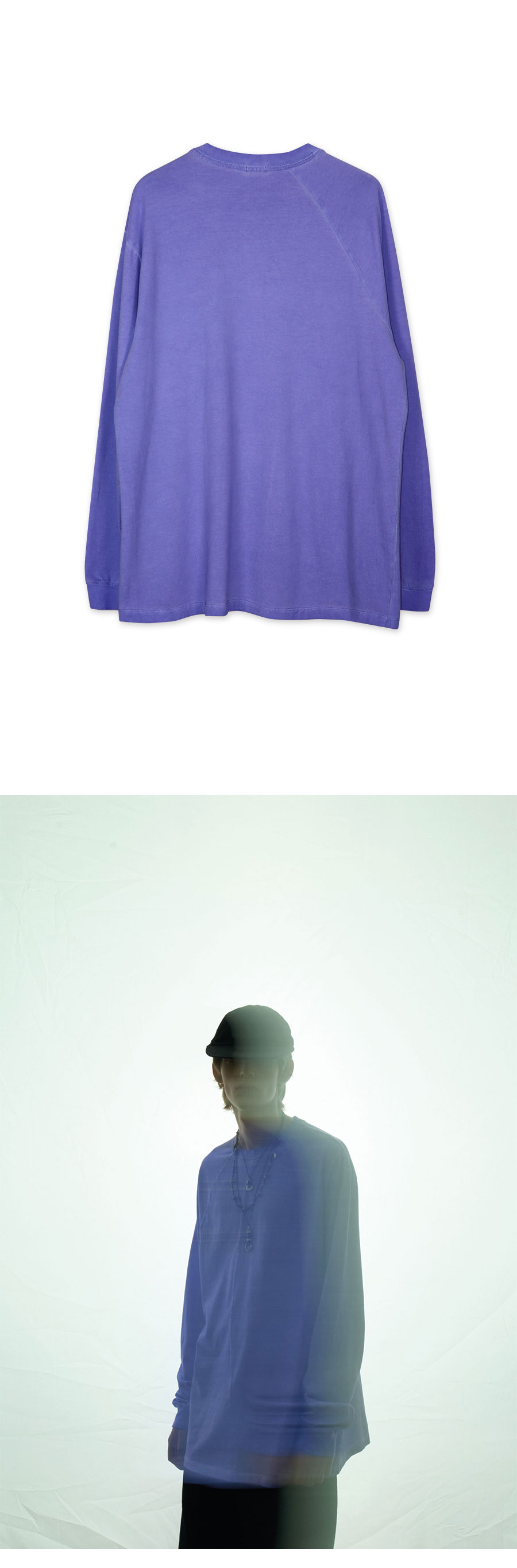 Material Outshell : Cotton 100% Colour : Washed Violet - 420g/sqm Heavy weight Cotton 100% - Tenta & Dumble Processing - Bio Washed processing - Pigment dyed - Asymmetrical sleeve line - Curved insicion line - 비대칭 소매 디자인의 다잉 롱슬리브 티셔츠