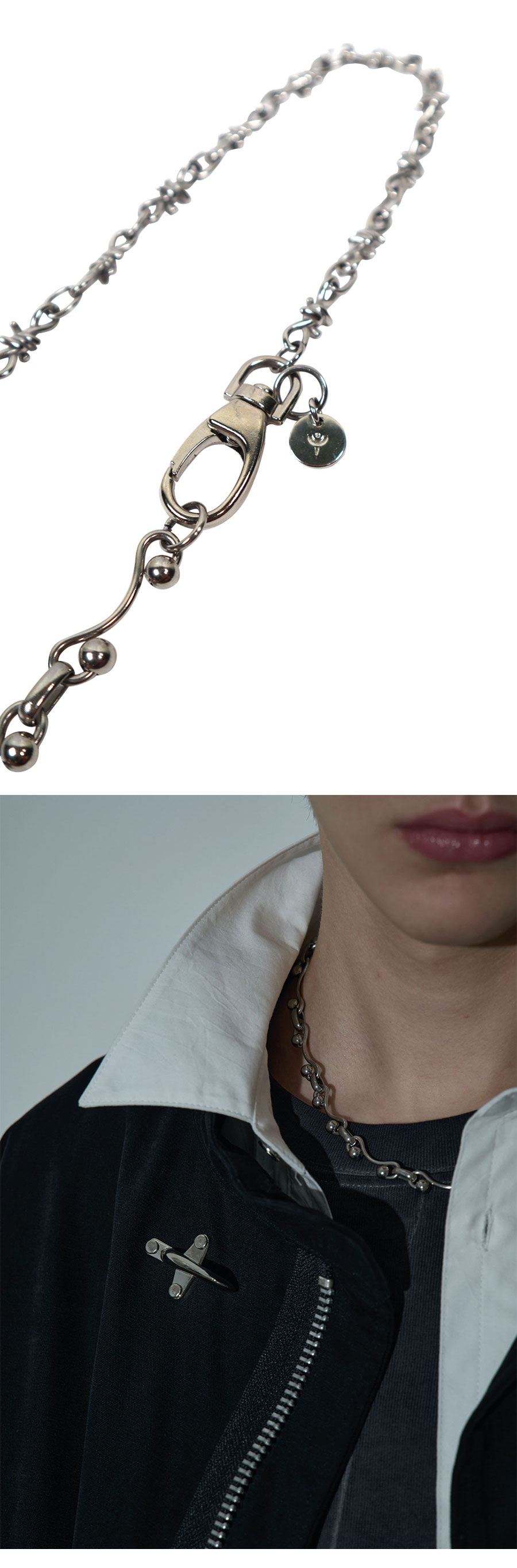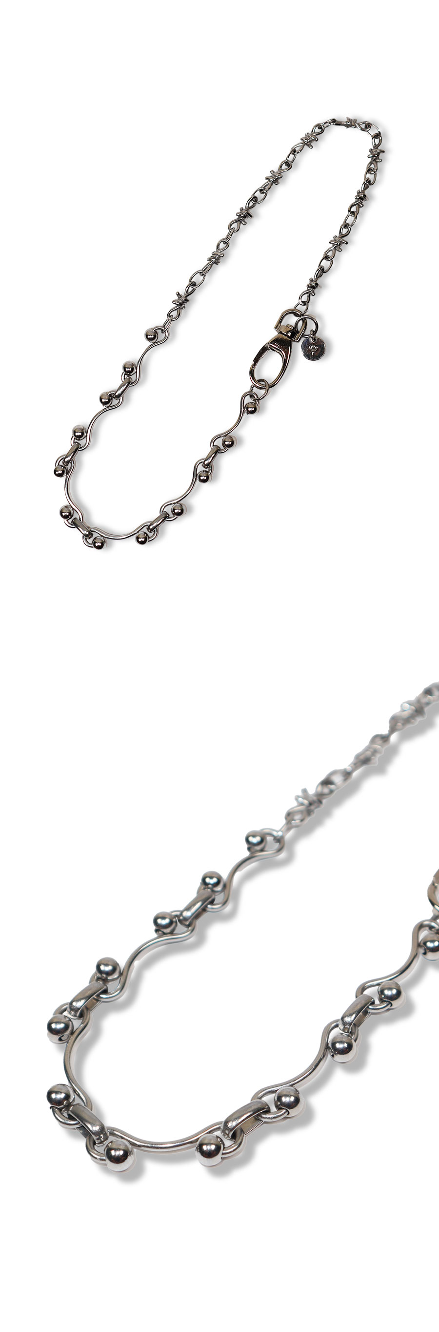Material Chain 1 : Surgical 100% Chain 2 : Surgical 100% Snap hook : Surgical 100% Colour : Antique silver - Chain mixed - Matte finishing snap hook - Logo point pendant - 두종류의 체인이 믹스된 서지컬 네클리스