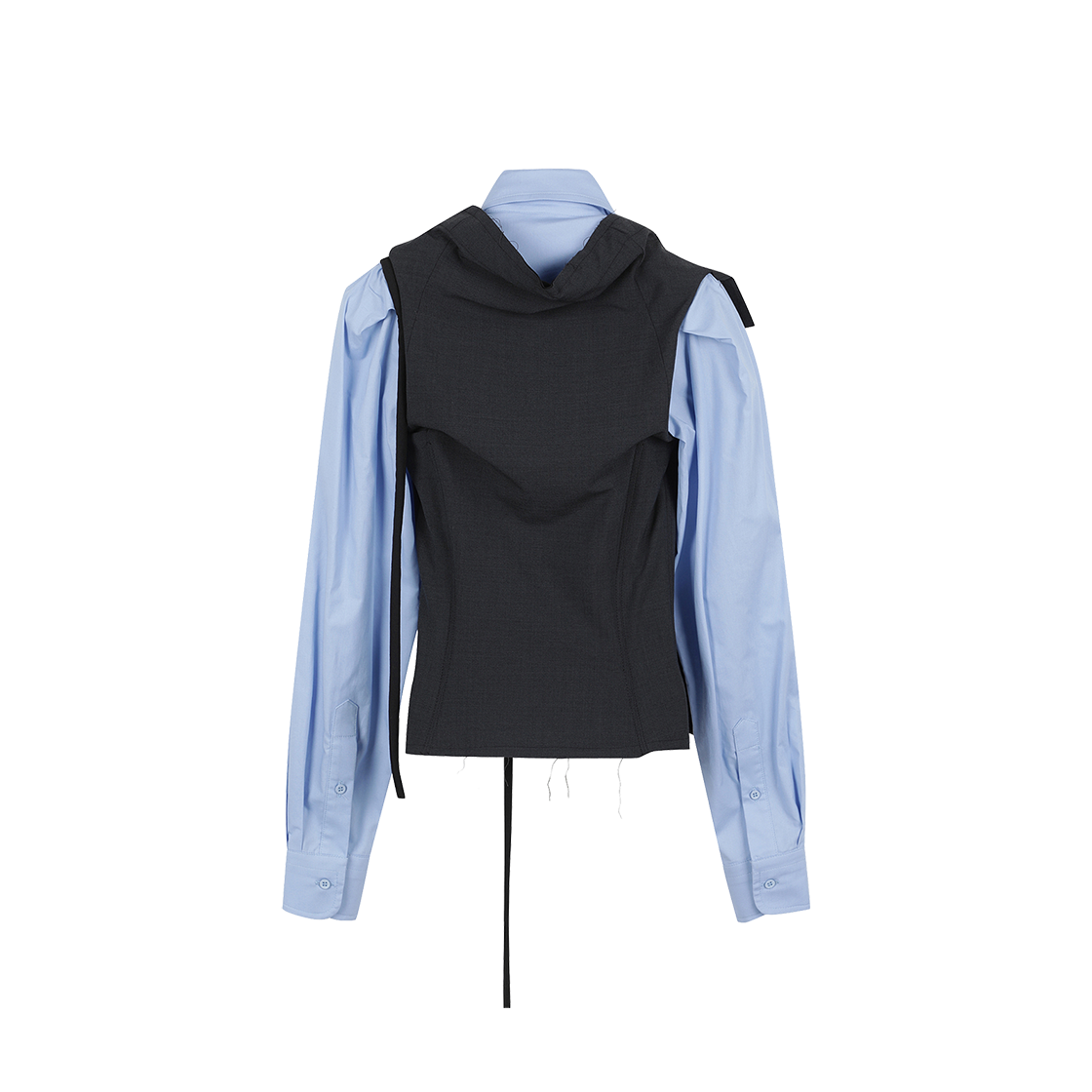 해체적인 비대칭 디자인으로 룩에 포인트를 줄 수 있는 오토링거의 라발리에르 블라우스입니다. - 스프레드 칼라 - 비대칭적인 패널 디자인 - 측면 히든 지퍼 클로징 - 러프한 마감 디테일 - 소매 버튼으로 실루엣 조절 가능