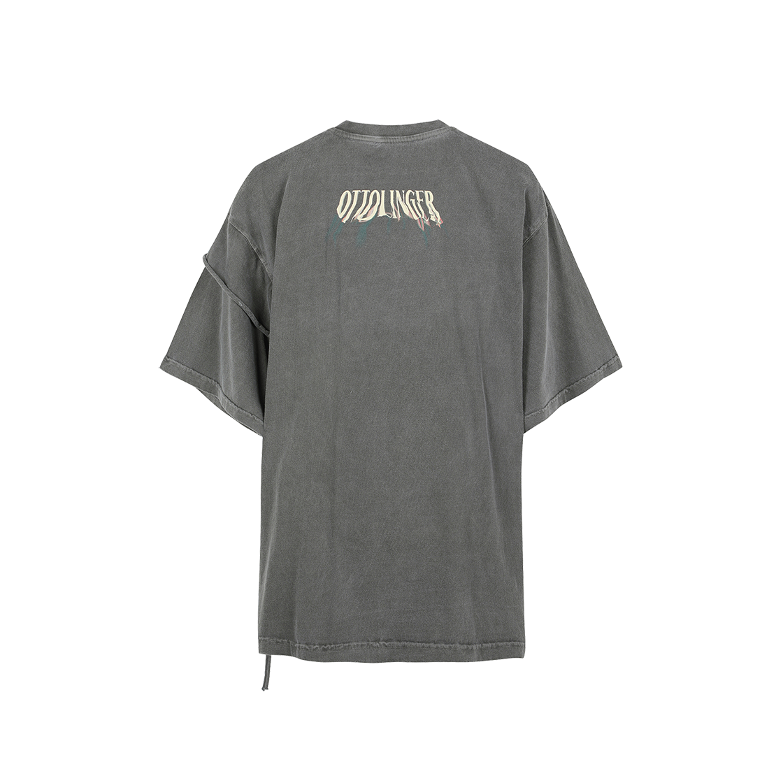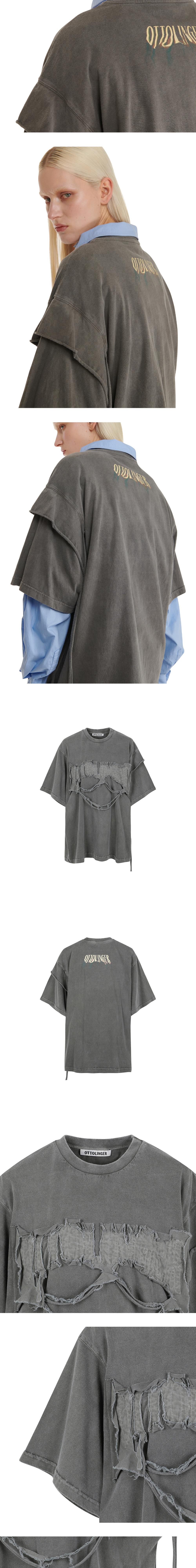 목뒤의 흘러내린듯한 자수와 이번 시즌만의 독특한 디테일이 매력적인 오토링거의 오버사이즈 티셔츠입니다. - 오버사이즈 핏 - 전면 디스트레스드 로고 아플리케 - 좌측 소매 레이어드 디테일 - 후면 로고 프린팅 - 워싱 처리된 원단 * 모델: 181cm, XS사이즈 착용