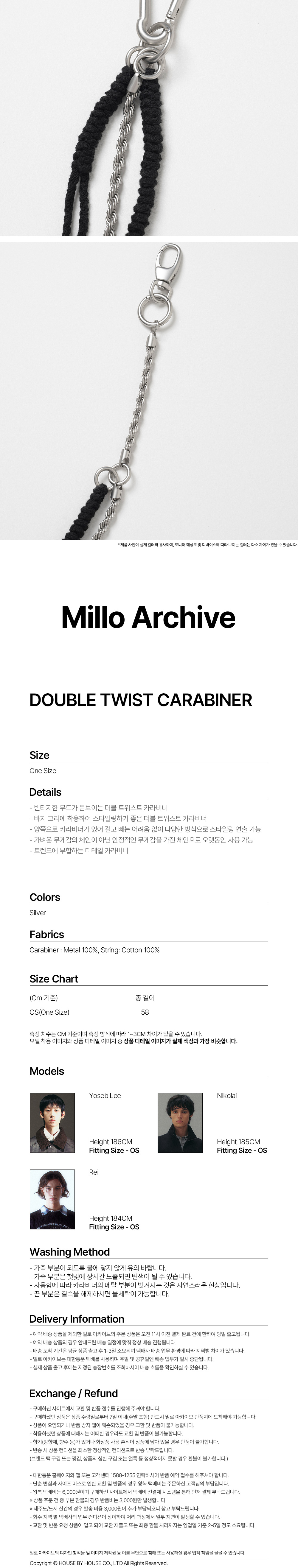 해당 상품은 10/17 순차 출고 예정입니다. - 빈티지한 무드가 돋보이는 더블 트위스트 카라비너 - 바지 고리에 착용하여 스타일링하기 좋은 더블 트위스트 카라비너 - 양쪽으로 카라비너가 있어 걸고 빼는 어려움 없이 다양한 방식으로 스타일링 연출 가능 - 가벼운 무게감의 체인이 아닌 안정적인 무게감을 가진 체인으로 오랫동안 사용 가능 - 트렌드에 부합하는 디테일 카라비너