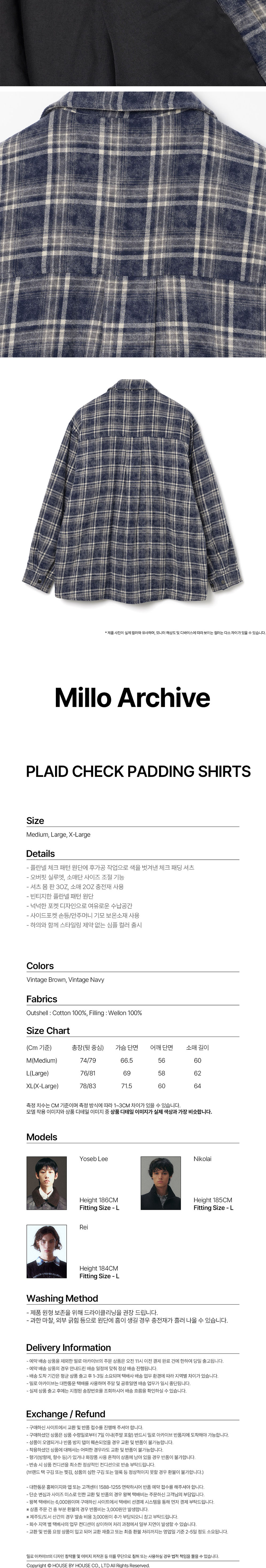 - 플란넬 체크 패턴 원단에 후가공 작업으로 색을 벗겨낸 체크 패딩 셔츠 - 오버핏 실루엣, 소매단 사이즈 조절 기능 - 셔츠 몸 판 3OZ, 소매 2OZ 충전재 사용 - 빈티지한 플란넬 패턴 원단 - 넉넉한 포켓 디자인으로 여유로운 수납공간 - 사이드포켓 손등/안주머니 기모 보온소재 사용 - 하의와 함께 스타일링 제약 없는 심플 컬러 출시