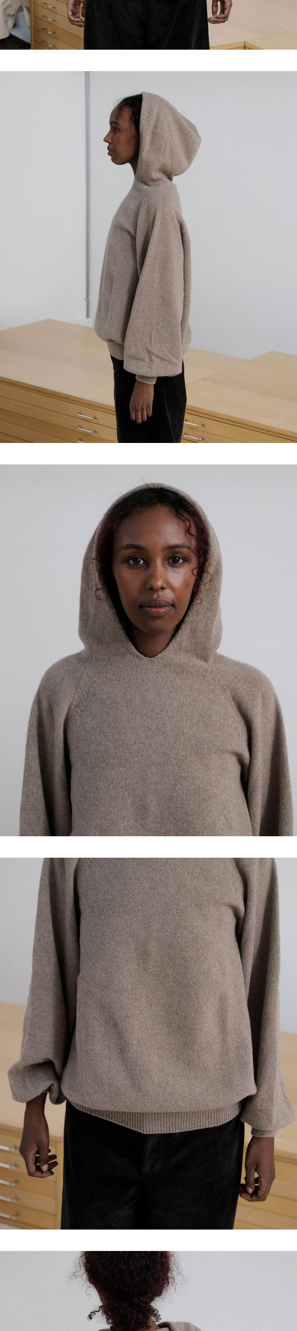 먹색과 닮은 브라운 컬러가 매력적인 베이스레인지의 소어 후디입니다. - 래글런 슬리브 - 후디 디테일 - 높은 보온성을 가진 메리노 울 소재의 도톰한 스웨터 후디 - 편안하면서도 재치있는 겨울철 이너 아이템으로 적합
