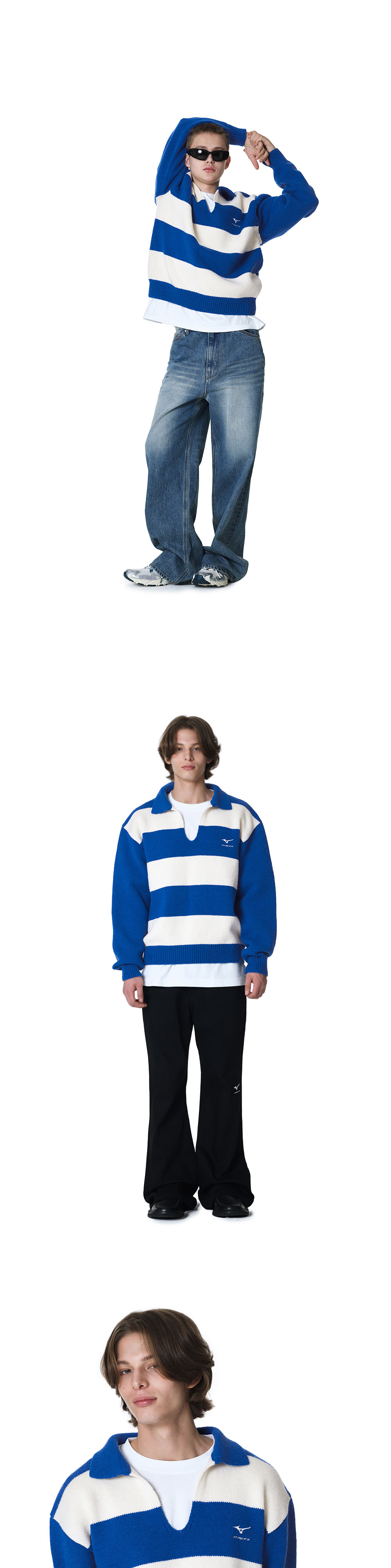 에스티유 X 미즈노 로고 엠브로더리 스트라이프 카라 니트 블루