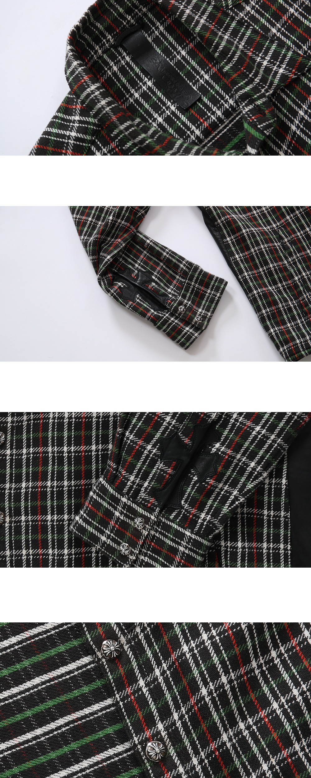 Chrome Hearts Leather Patch Shirt Jacket 크롬하츠 레더 패치 셔츠 자켓 *상품 상태 중고 상품 B등급 *소재 면, 양가죽, 925실버 *사이즈: XL (측정 방법에 따라 사이즈에 일부 오차가 있을 수 있습니다.) *구성품: 자체 보증서, 폴리싱천