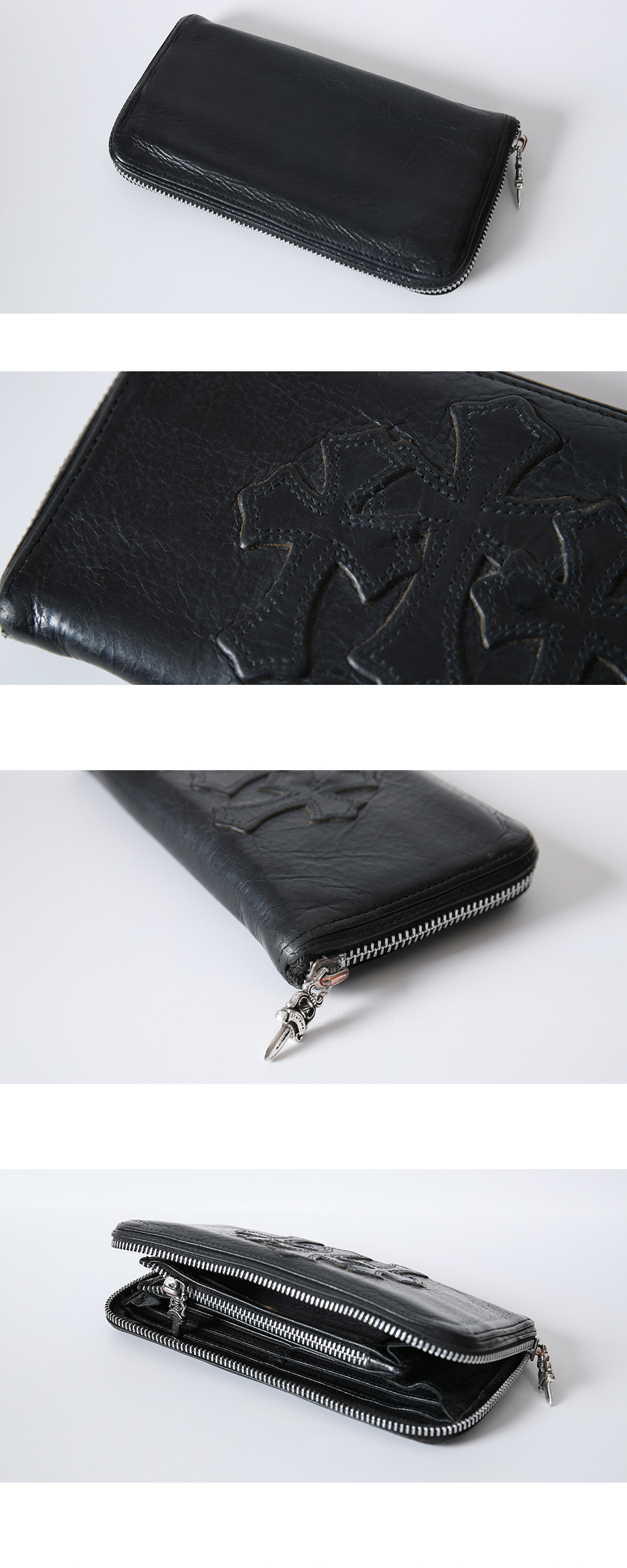 Chrome Hearts 3 Cross Round Zipper Leather Wallet Black 크롬하츠 3 크로스 라운드 지퍼 레더 월렛 블랙 *상품 상태 중고 상품 B등급 *소재 가죽, 925실버 (측정 방법에 따라 사이즈에 일부 오차가 있을 수 있습니다.) *구성품: 자체 보증서, 폴리싱천
