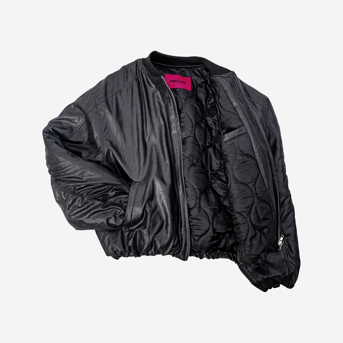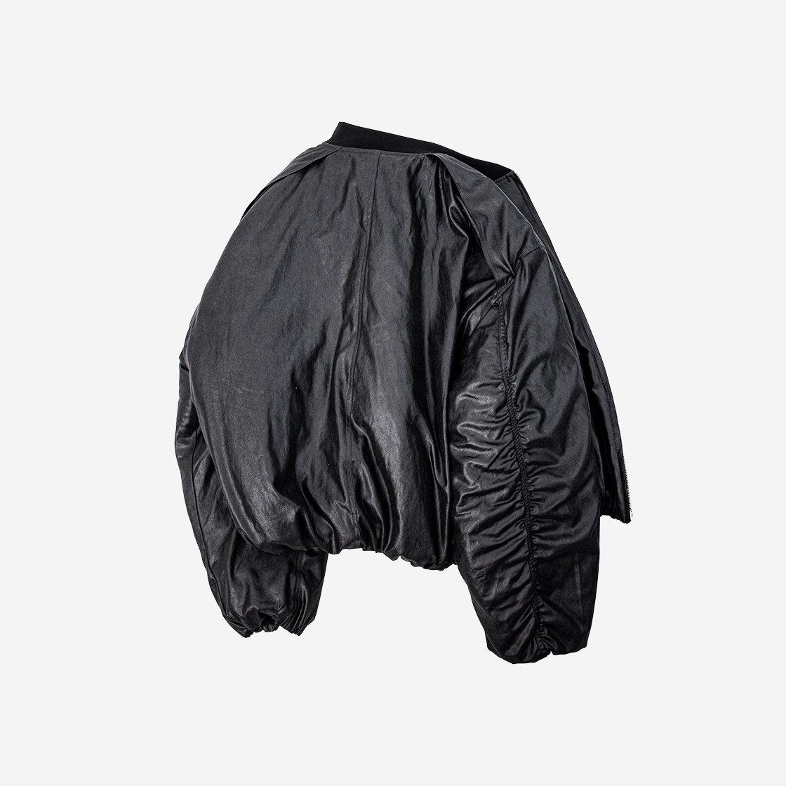 숏한 기장감의 포멀함과 사틴 소재의 빈티지한 무드를 동시에 연출 가능한 MA-1 아우터 FEATURE - 오버핏 숏 자켓 - 포켓 내부 지퍼 디테일 - 사틴 소재 - 뒷 소매 셔링 - 소매, 밑단 밴드 내장