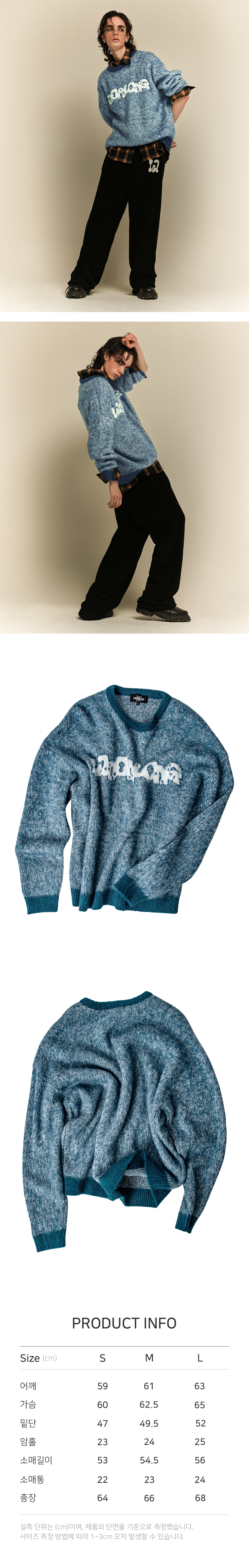 부드러운 브러쉬드 소재를 이용하여 보온성과 착용감을 높인 니트 FEATURE - 멜로우 에디션 라인 - 비트맵 타이포 로고 그래픽 - 브러쉬드 소재 - 넥/소매/밑단 솔리드 포인트