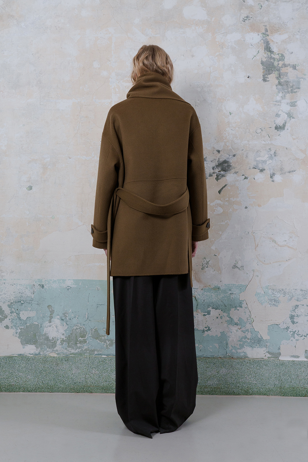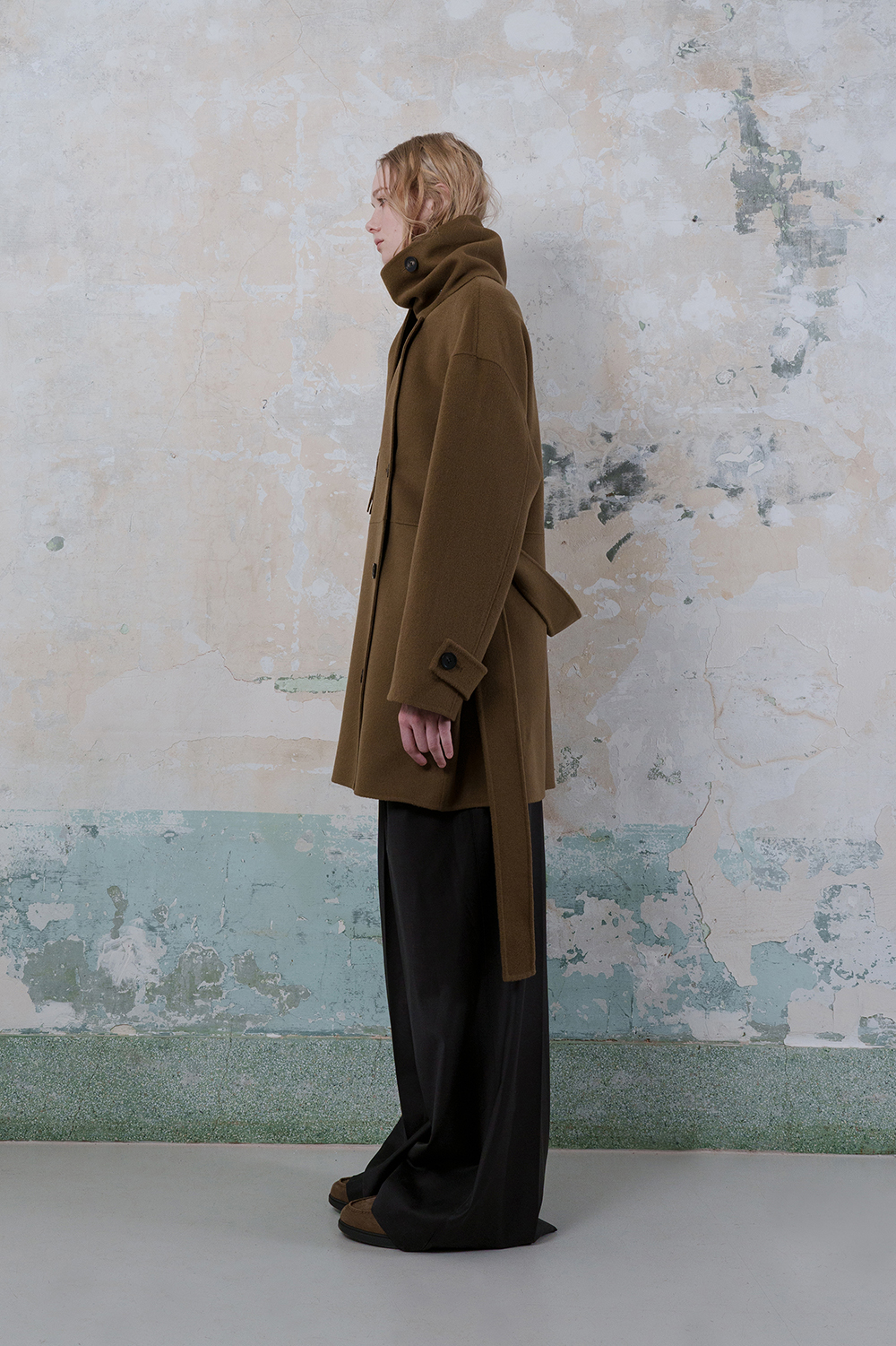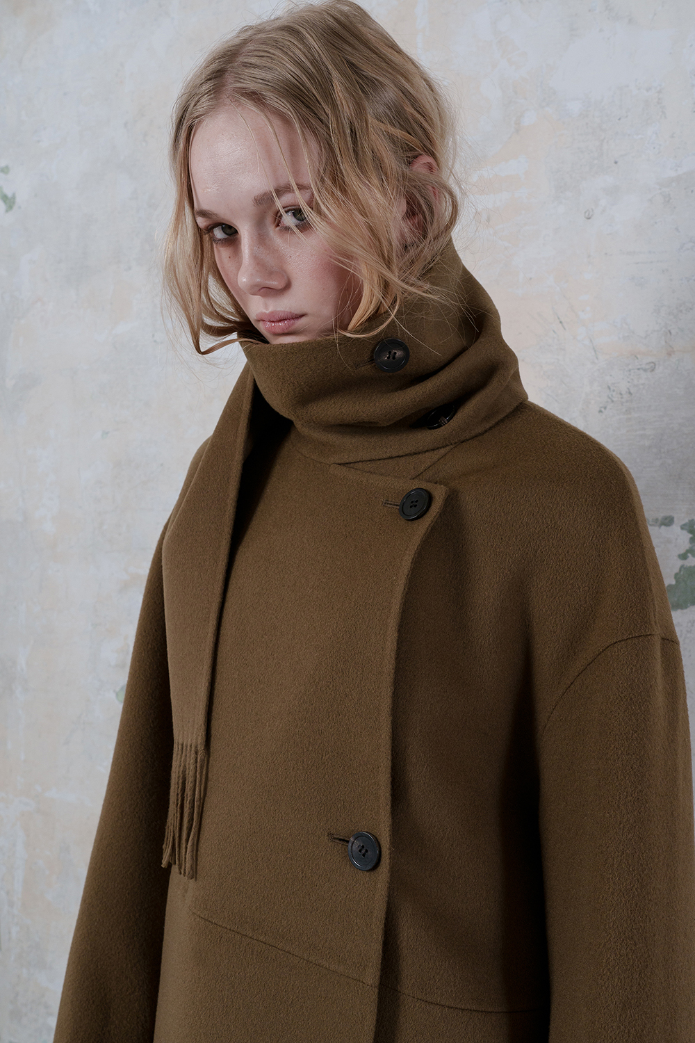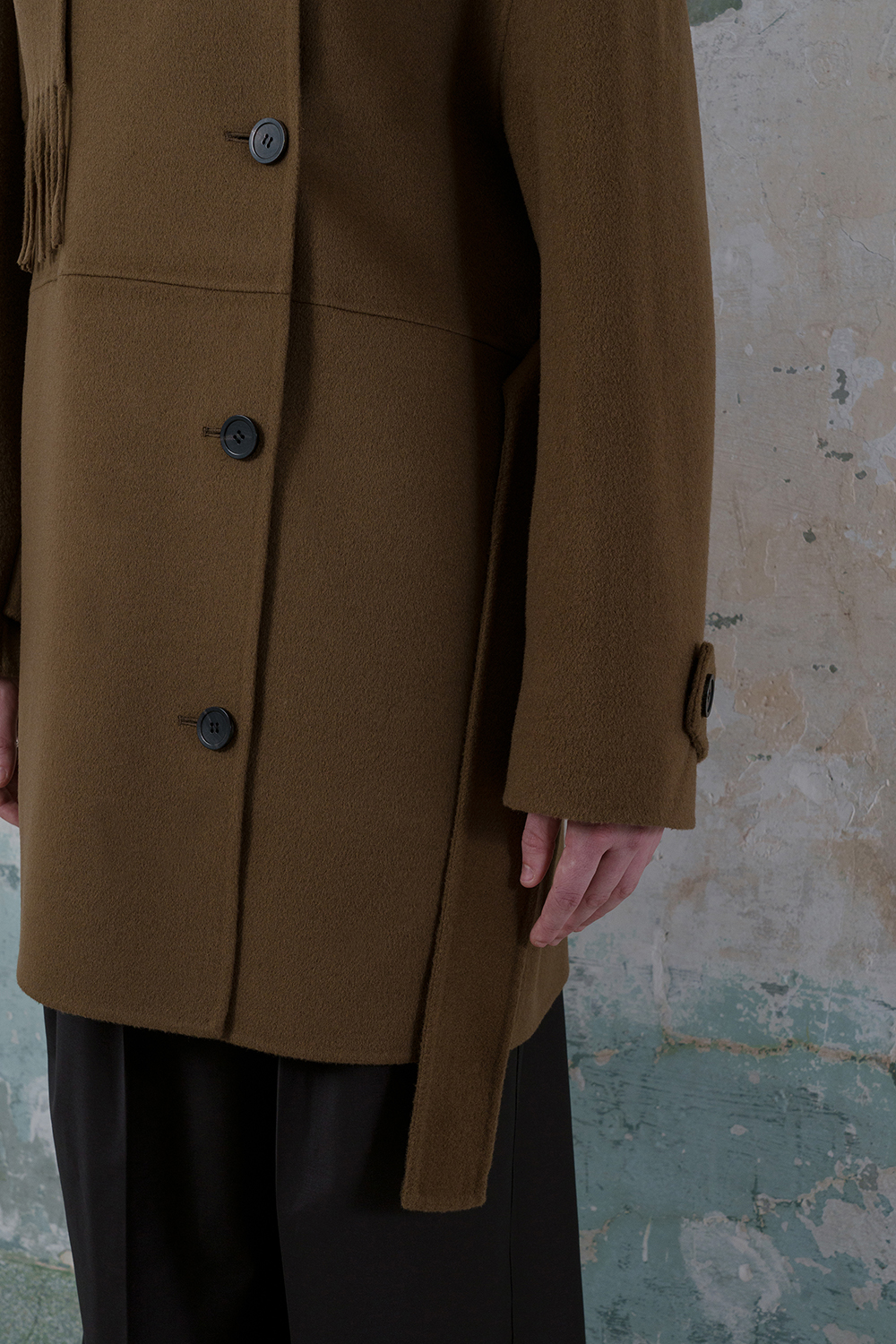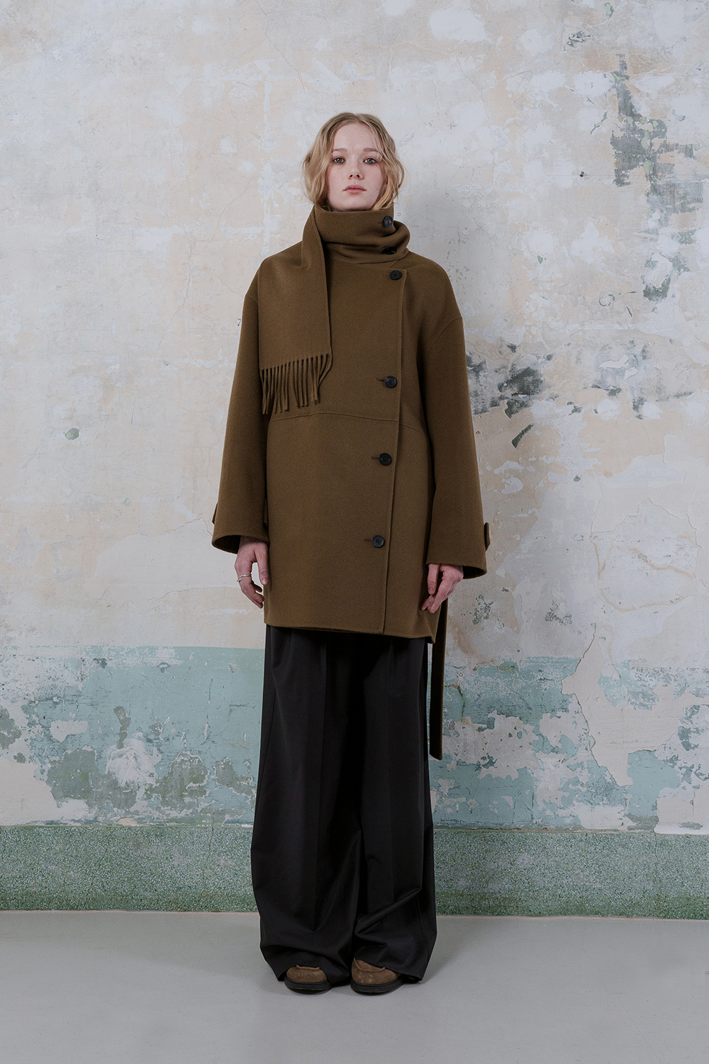 모델은 173cm이고 M 사이즈를 착용하였습니다. - 프린지 머플러가 포함된 양면 울 혼방 소재로 제작되어 고급스러운 질감을 제공합니다. -남성복의 스톰 칼라에서 영감을 받은 머플러가 있는 독특한 칼라 디자인이 특징입니다. -드롭 숄더가 적용된 여유로운 실루엣으로 편안하면서도 스타일리시한 핏을 연출합니다. -옆 솔기 주머니가 있어 실용성을 더했습니다. -손목 부분에 플랩이 달려 있으며 소뿔 버튼 여밈으로 클래식한 디테일을 완성했습니다. -실루엣을 균형 있게 유지하기 위해 탈부착 가능한 허리 벨트 끈이 장착되어 있어 다양한 스타일 연출이 가능합니다. -안감이 없는 디자인으로 자연스러운 착용감을 제공합니다.