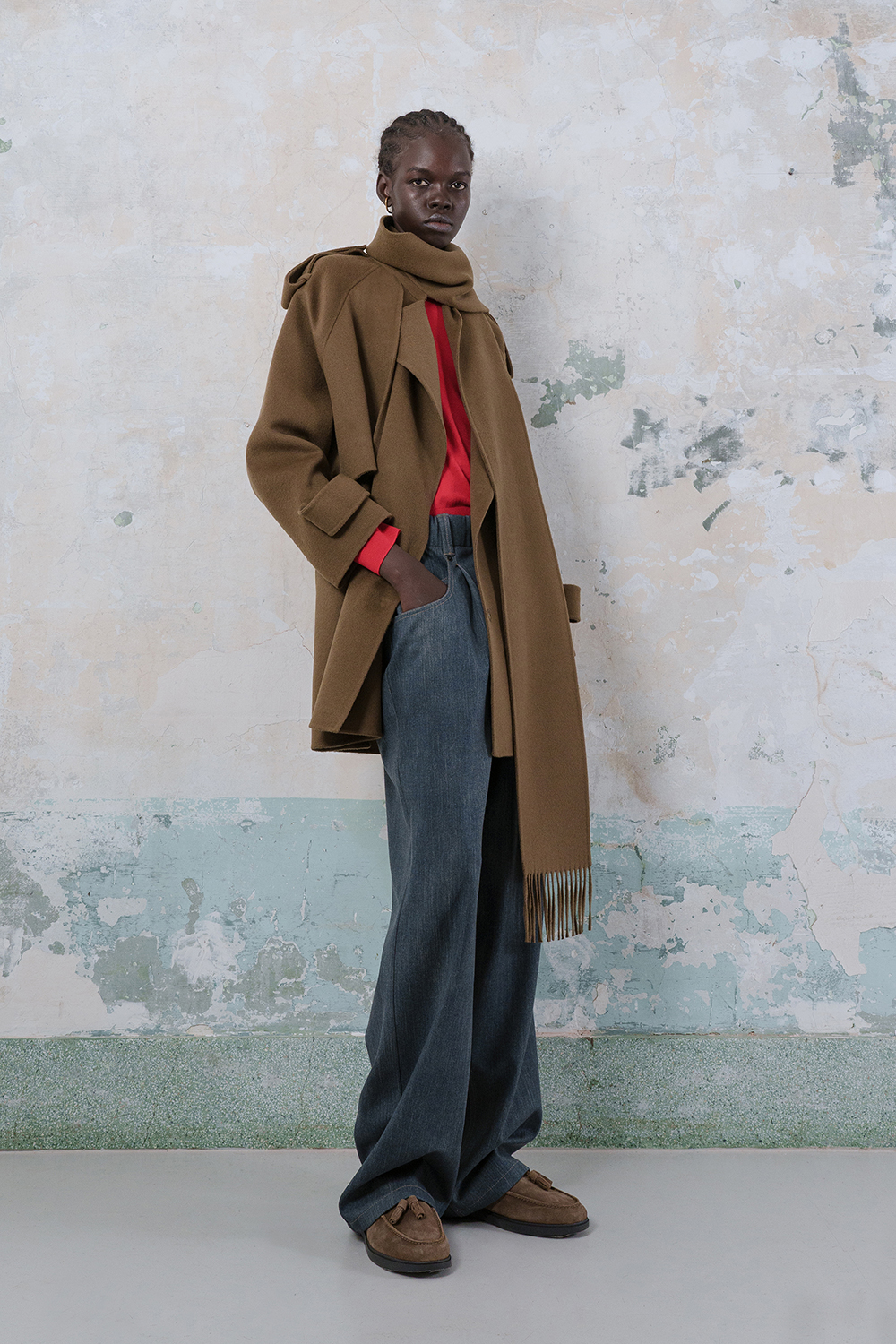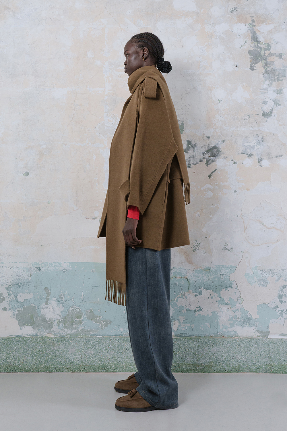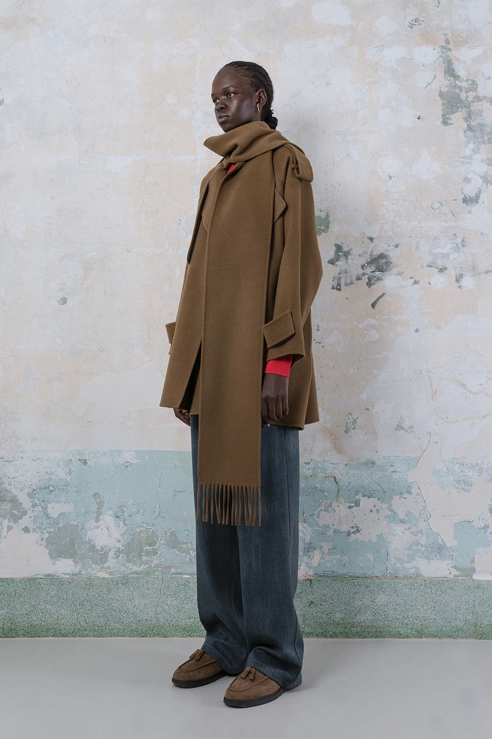 모델은 178cm이고 M 사이즈를 착용하였습니다. - 프린지 머플러가 포함된 양면 울 혼방 소재로 제작되어 고급스러움을 더했습니다. - 옆 솔기 주머니가 있어 실용성을 제공합니다. - 손목에 플랩이 있어 디자인적 디테일과 기능성을 동시에 갖추고 있습니다. - 실루엣을 균형 있게 유지하기 위해 탈부착 가능한 허리끈이 장착되어 있으며, 다양한 스타일링이 가능합니다. - 어깨에 견장이 있어 더욱 독특한 디자인 요소를 더했습니다. - 앞면은 숨겨진 스냅 버튼과 네크라인의 후크 여밈으로 깔끔하게 마감되었습니다. - 라펠 고정을 위한 스냅 버튼이 있어 스타일링에 유연함을 더했습니다. - 안감이 없는 디자인으로 가볍고 자연스러운 착용감을 제공합니다.