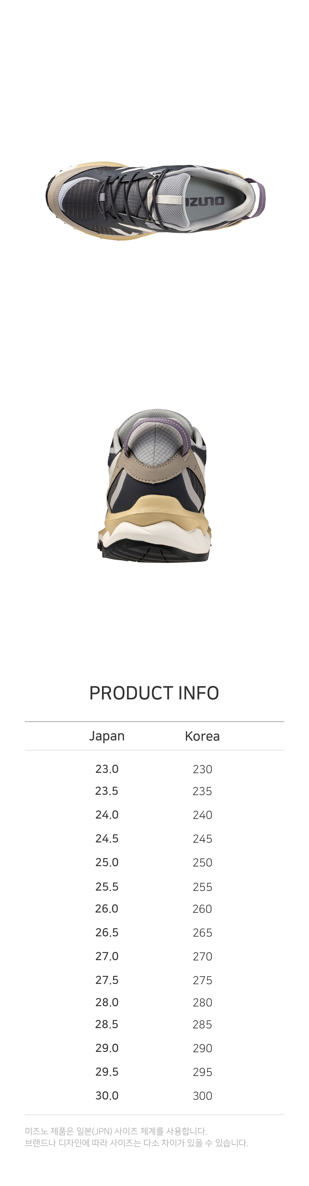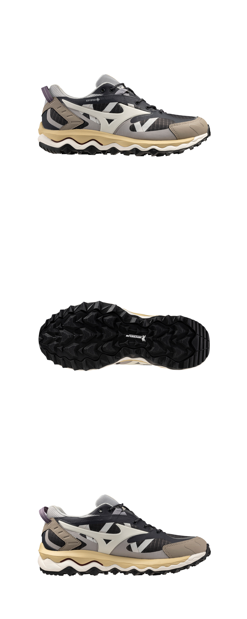 미즈노 트레일화의 큰 특징인 "Michelin Sole"을 활용하여 견고한 내구성 및 아이코닉한 아웃솔 형태가 특징인 슈즈입니다.