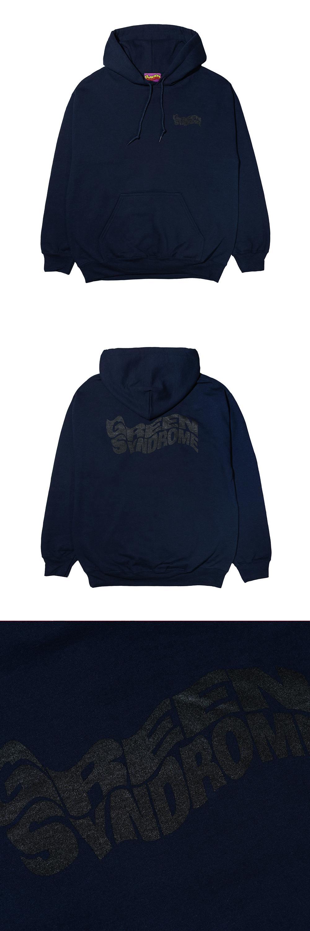 GREEN SYNDROME WEIRD LOGO HOODIE NAVY Printed front and back graphics 100% Cotton Made in Korea