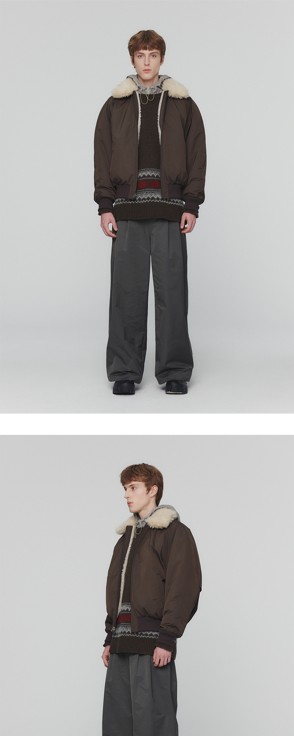 리버시블 디자인으로 2가지 스타일을 연출할 수 있는 아모멘토의 오버사이즈 시어링 점퍼입니다. - 리버시블 디자인 - 1온스 패디드로 뛰어난 보온성 - 양면 퍼 카라 디자인 - 래글런 패턴으로 편안한 착용감 - 소매 및 밑단 시보리 디테일 * 모델 (W): 172cm, M 사이즈 착용