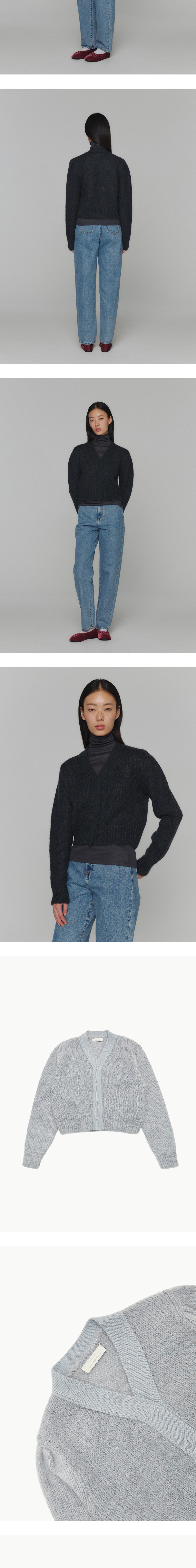 미니멀한 디자인과 모헤어 소재가 세련되면서도 포근한 느낌을 주는 아모멘토의 그랜마 가디건입니다. - 레귤러 핏 - 아모멘토 익스클루시브로 개발된 모헤어 원사 사용 - 빈티지하고 헤어리한 질감 - 어깨 셔링 디테일로 볼륨감 있는 실루엣 - 여유 있는 소매 및 크롭 기장 - 허리 및 손목 립 마감 - 히든 스냅 버튼 클로징 *모델샷은 동일 모델의 블랙 컬러입니다.