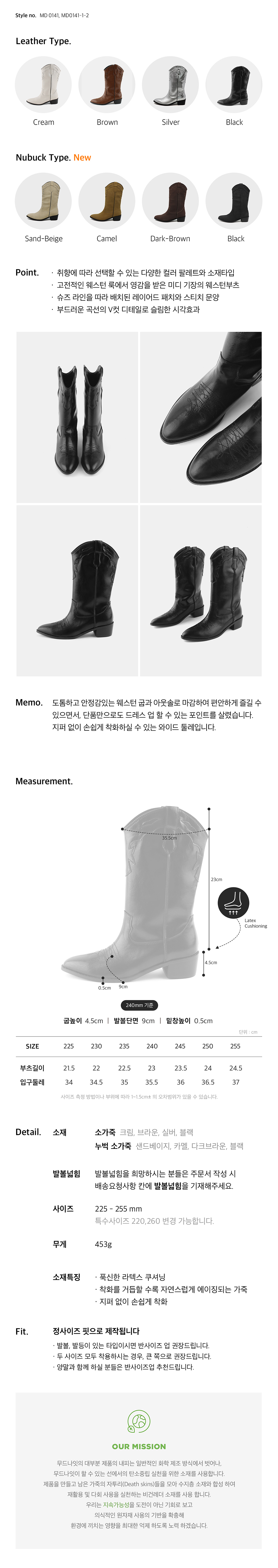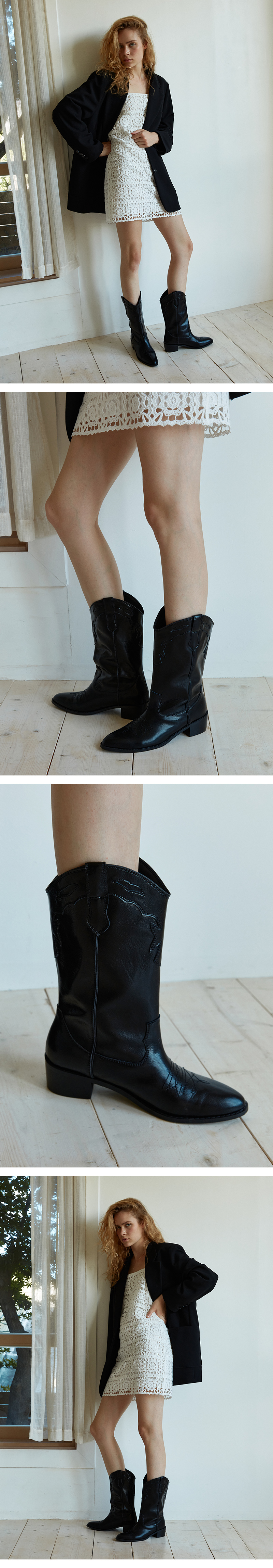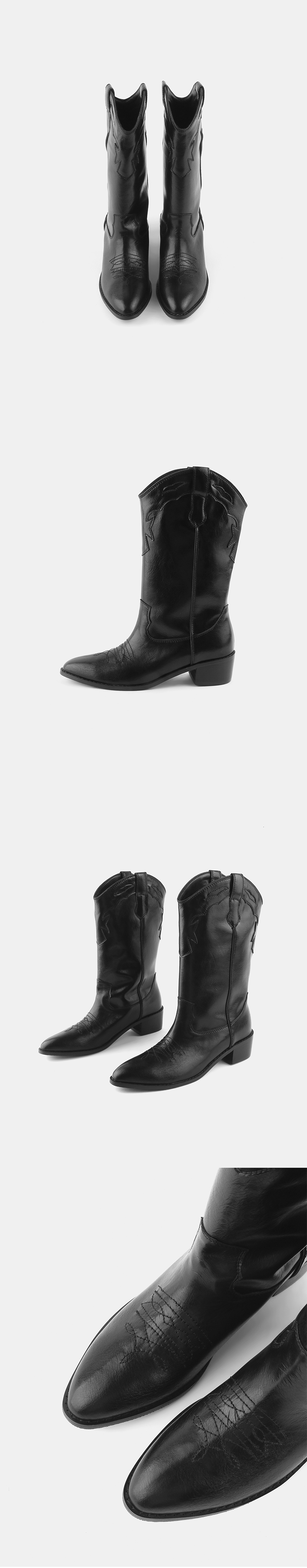 고전적인 웨스턴무드에서 영감을 받은 하프기장의 레더부츠, 감각적인 패치워크와 스티치 문양이 특징입니다.