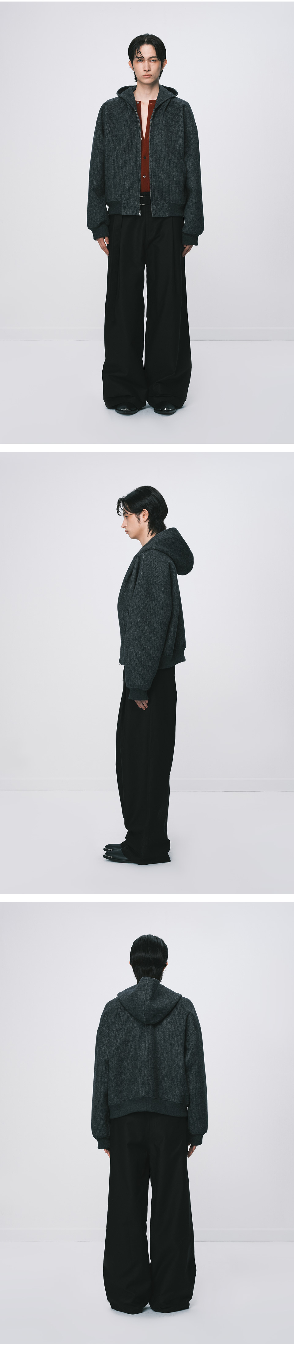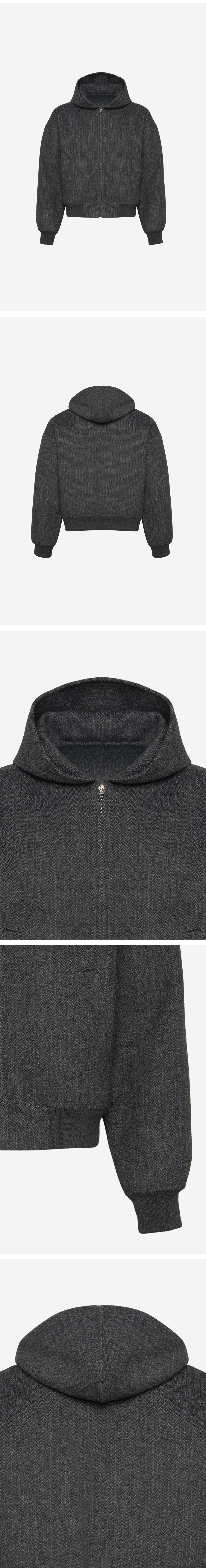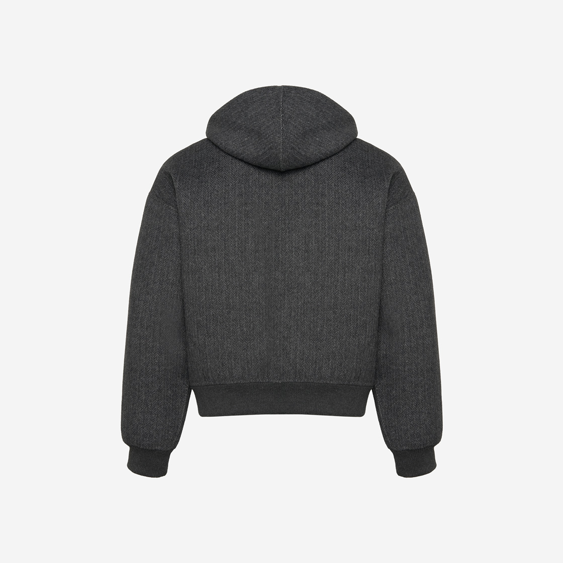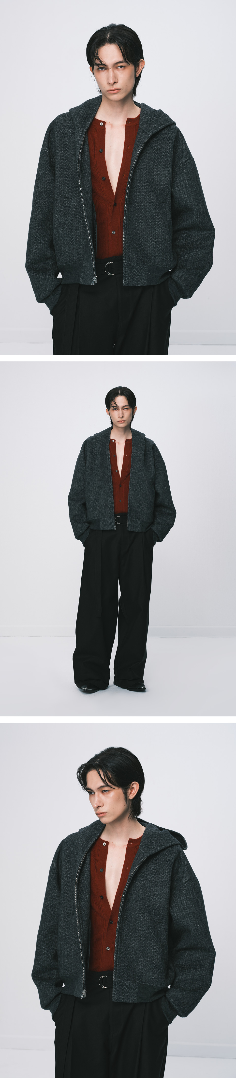 핸드메이드 헤링본 후디드 점퍼입니다. 헤링본 울 소재와 Lampo 지퍼 디테일로 고급스러움을 더했으며, 니트 시보리 마감으로 편안한 착용감과 함께 실루엣을 잡아줍니다. 헤링본 패턴과 블루종 스타일이 조화를 이루어 캐주얼하면서도 스타일리시한 아이템입니다.