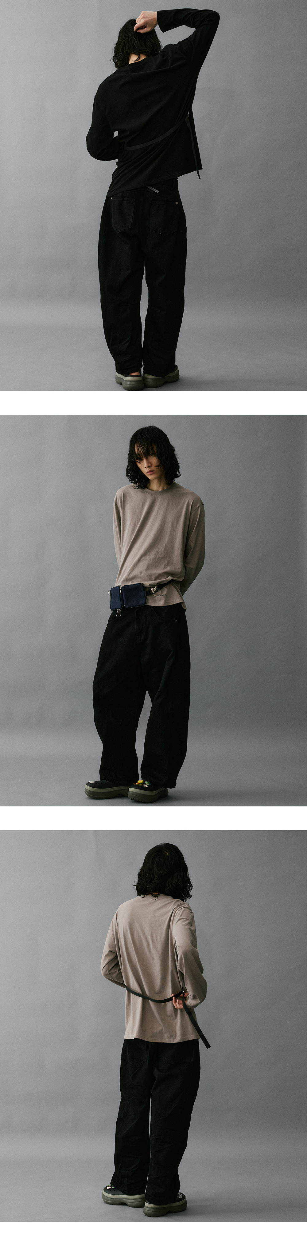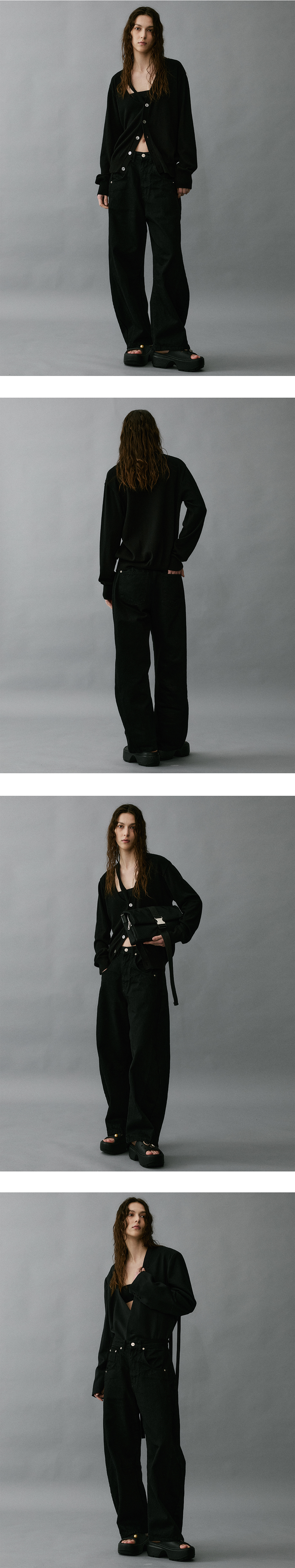 - 혼용율 Cotton 100 - 와이드 핏 (여성은 S, 남성은 M,L 추천) - 허리사이즈 S - 26/27, M - 30/31, L - 32/33 - 블랙 염료를 어둡게 유지하기 위해 실리콘 작업 후 유연처리 진행 - 뒤 허리벨트 고리에 시그니쳐 가죽테이프 디테일 (탈착가능)