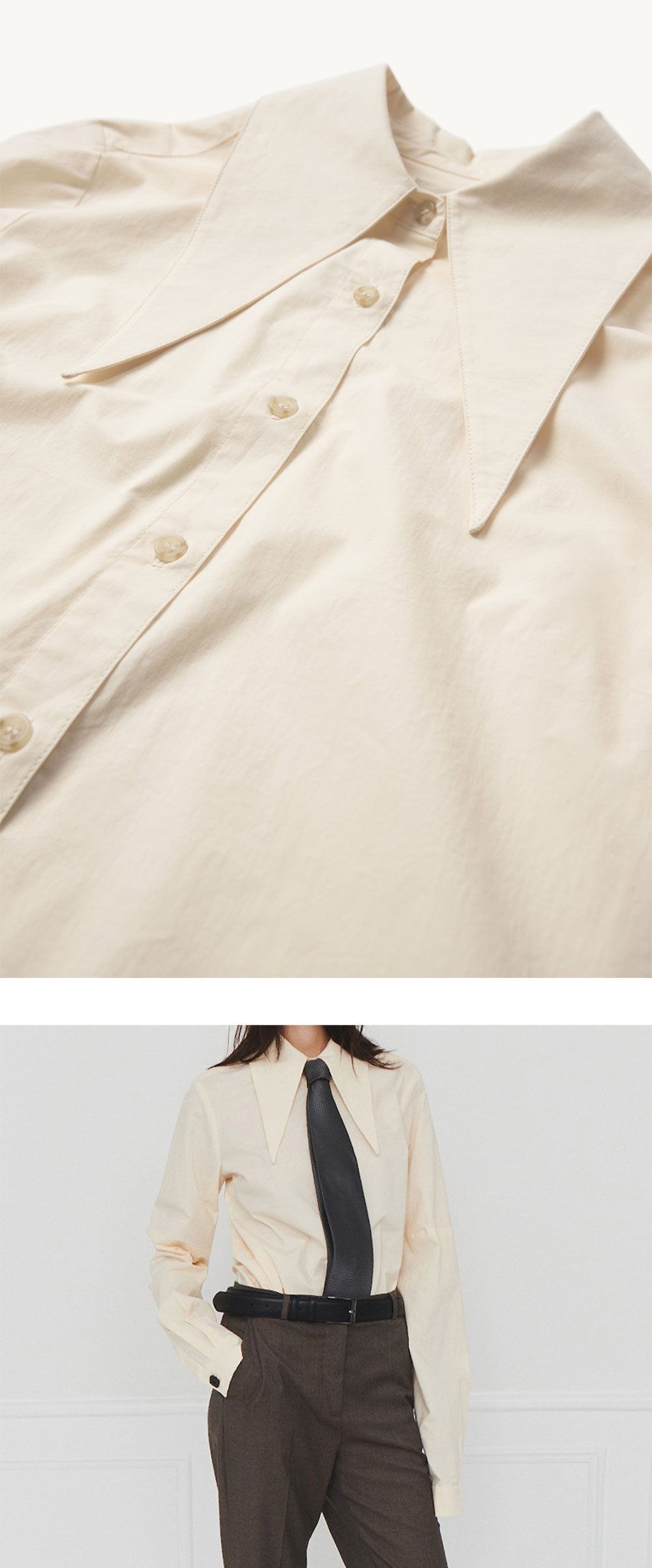 포인트 칼라가 매력적인 더가먼츠의 바닐라 컬러슬리브 셔츠입니다. - 포인티드 칼라 - 배럴 커프스