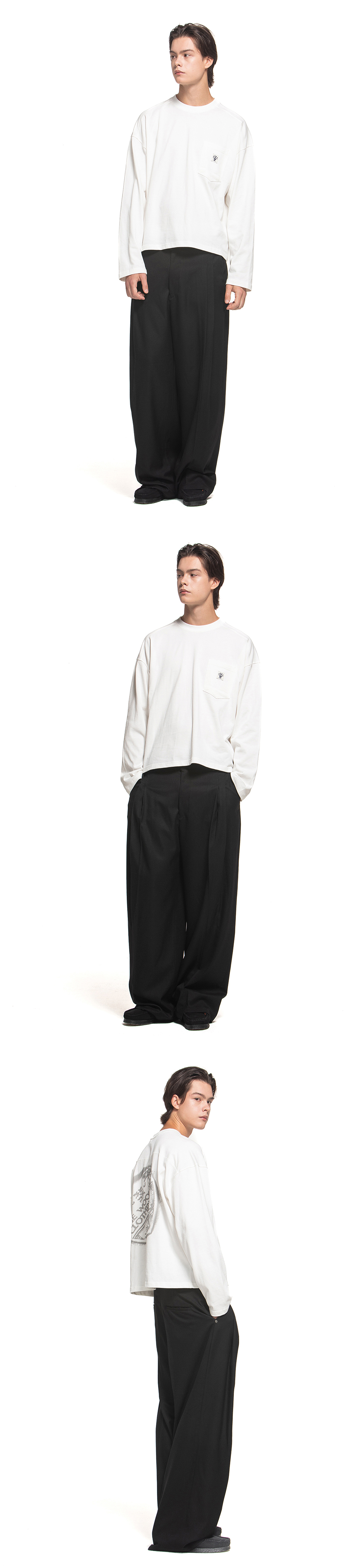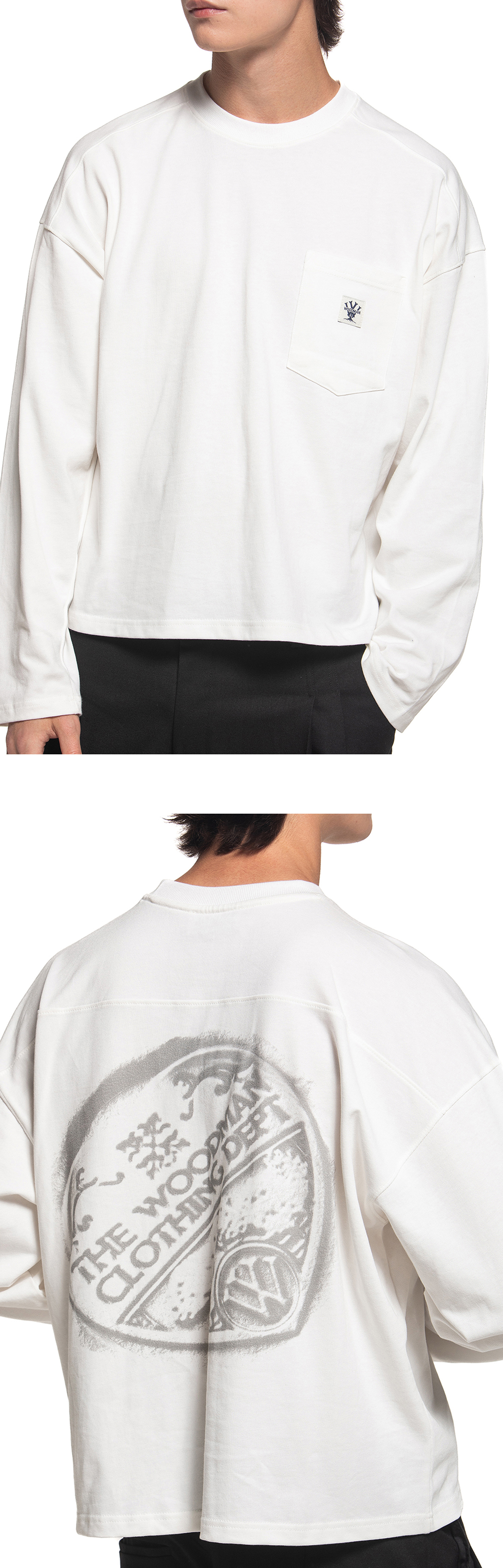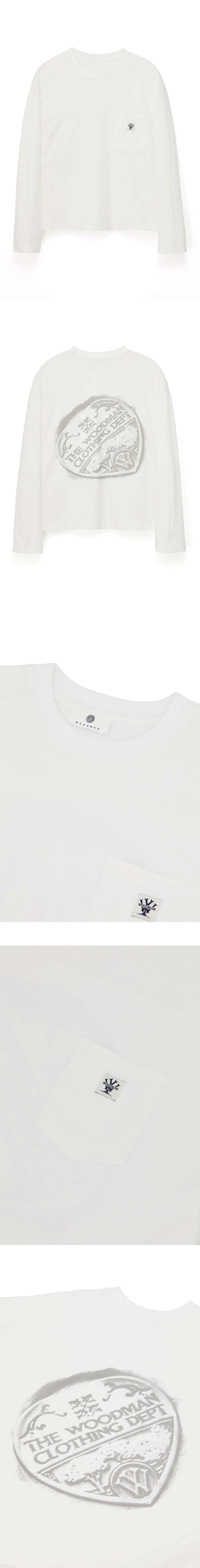 하트형태의 우드먼 로고를 왁스 씰링 그래픽으로 표현한 롱 슬리브 입니다. 기장이 짧고 소매가 길게 떨어지는 디자인된 제품입니다. - 전면 가슴 포켓과 포인트 라벨 - 후면 왁스 씰링 프린팅