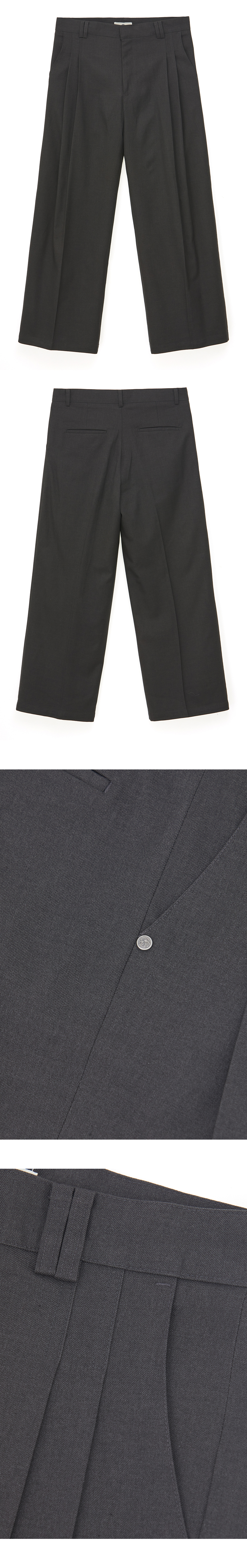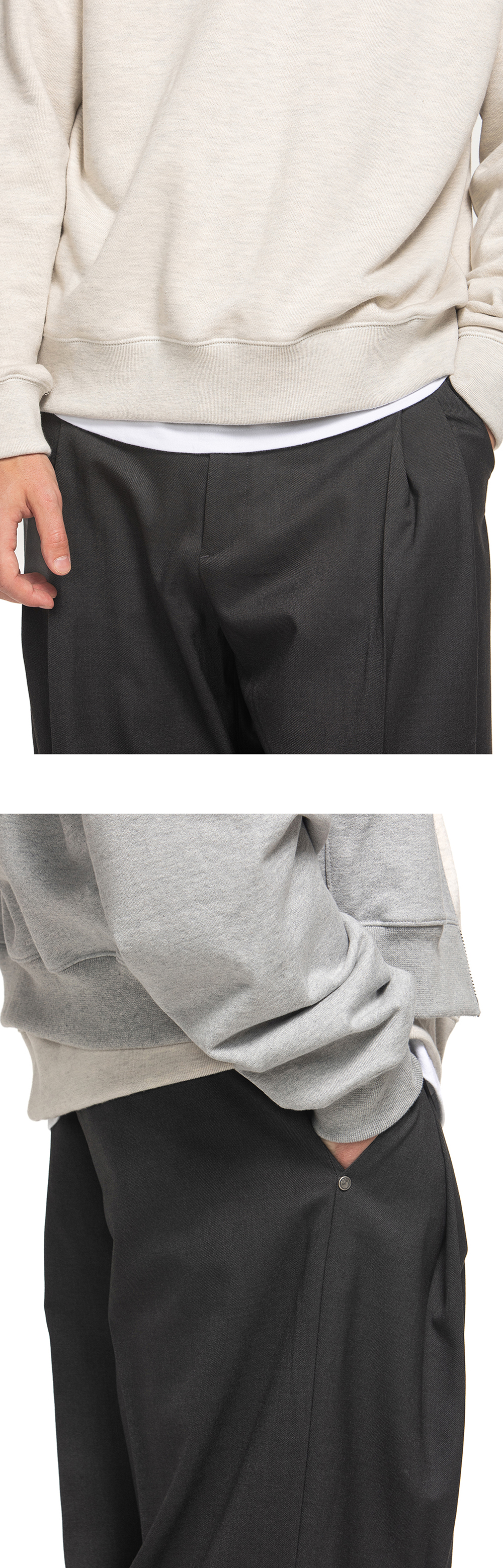와이드한 핏의 슬랙스 입니다. 전면에 2개의 핀턱 주름과 스티치 있으며 주머니 입구에 우드먼 리벳이 있습니다. - 2개의 핀턱 주름 - 핀턱 스퀘어 스티치 - 주머니 우드먼 리벳