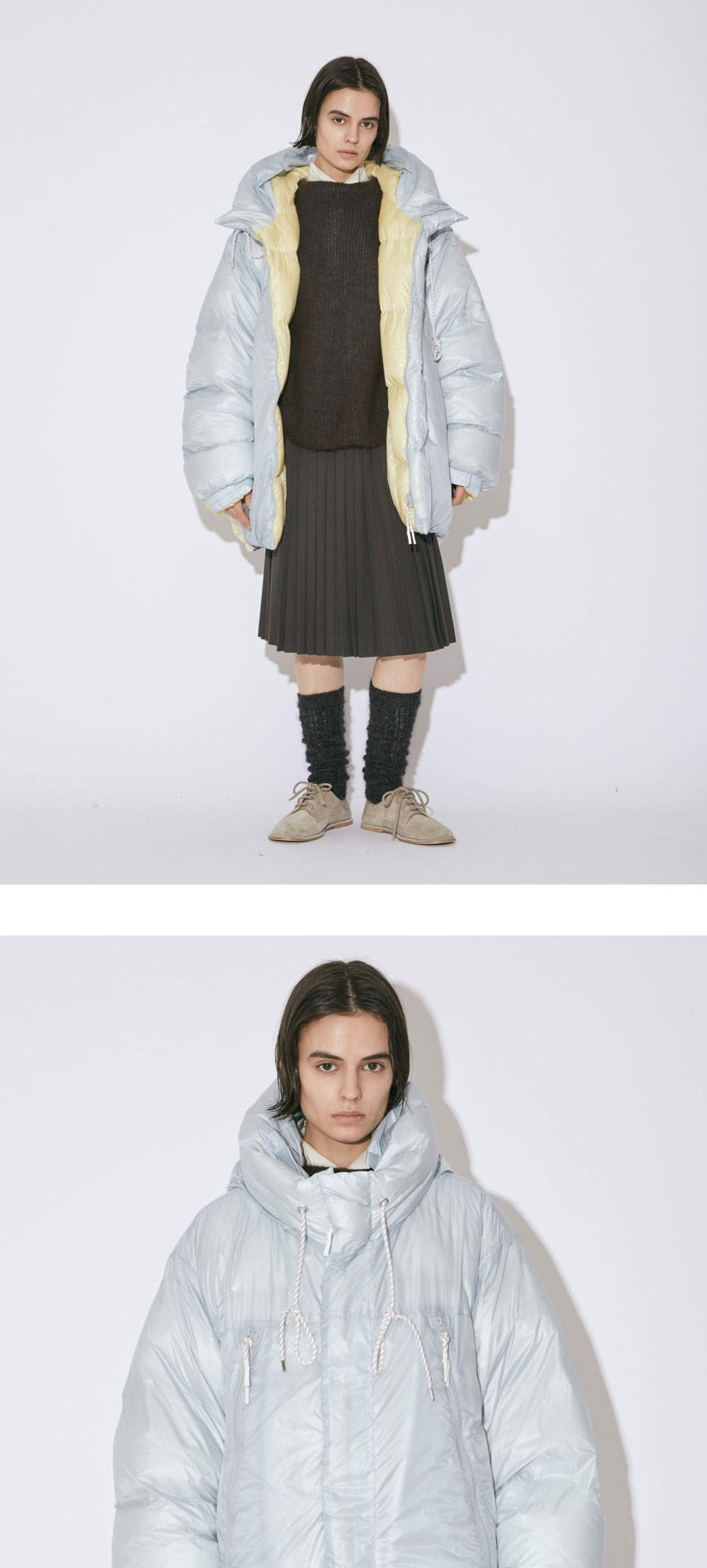 NANGA와 첫 번째 콜라보인 유니섹스 다운 자켓인 뷰티풀 피플의 슬리핑 백 다운 코트 입니다. - 가볍고 오버사이즈 핏 - 리버시블 디자인으로 두가지 컬러 연출 가능 - 스탠드 칼라로 후드 실루엣 변형 가능 - 워터프루프 원단 - Down fill power 700 *여성 모델 176cm 40 size 착용 / 남성 모델 186cm 42 size 착용