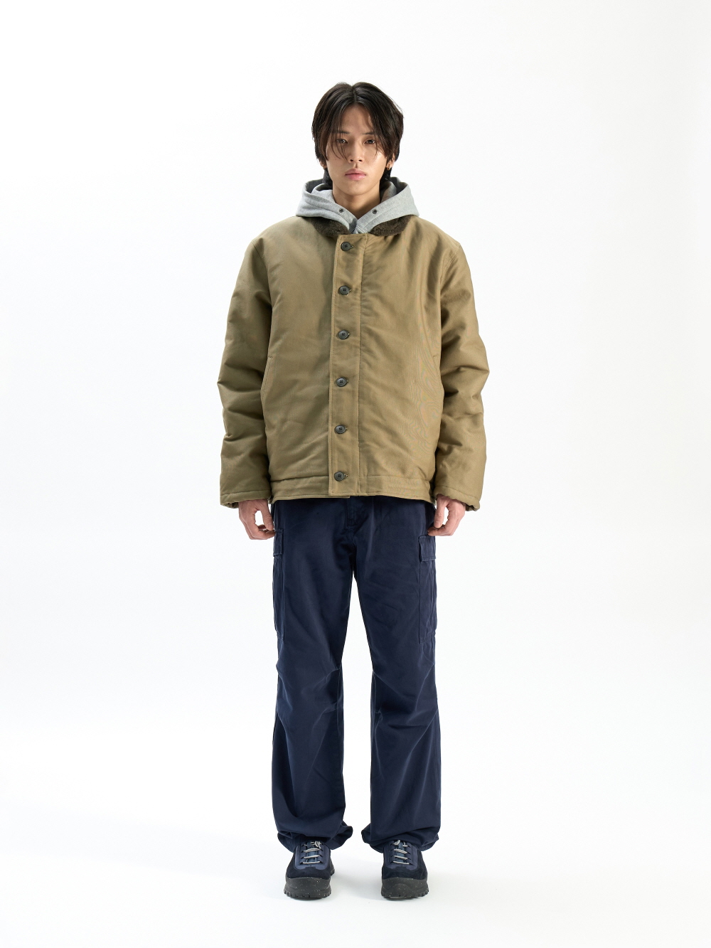 클래식 덱 자켓은 1940년대 미 해군 자켓에서 영감을 받아, 편안한 면 소재로 캐주얼하게 완성되었습니다. · 1940년대 미국 해군 3형 N-1 덱 자켓 복각디자인 · 인조 무톤 안감 및 칼라 · 울 혼합 스톰 커프 · 프론트 웰트 포켓 · 조절 가능한 드로스트링