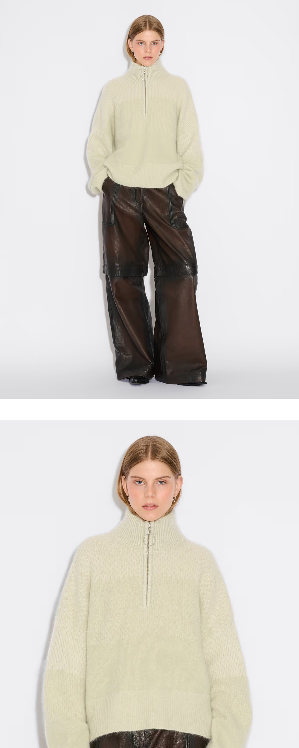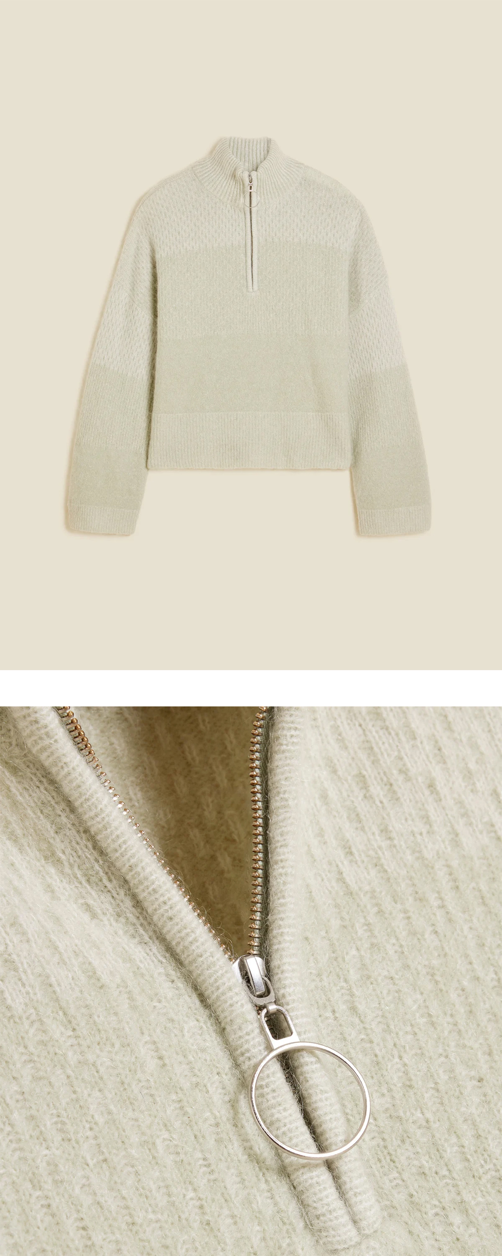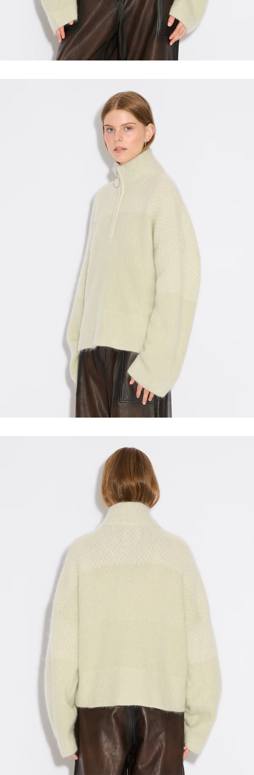 컬러 블럭마다 다른 짜임이 매력적인 홀츠베일러의 하프 집 니트입니다. - 오버사이즈 핏 - 드랍 숄더 디자인 - 시그니처 메탈 지퍼 풀러 - 부드러운 모헤어 혼방 소재 - 그라데이션 자카드 패턴 디테일