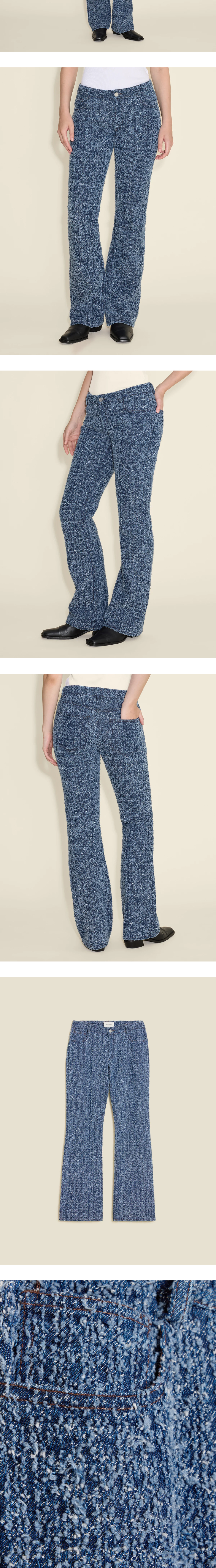 24AW 런웨이의 아이콘, 특수한 데님 원단이 적용된 홀츠베일러의 데님 팬츠입니다. - 로우라이즈 스타일 - 플레어 핏 - 5포켓 디자인 - 입체감 있는, 닳은 느낌의 데님 원단