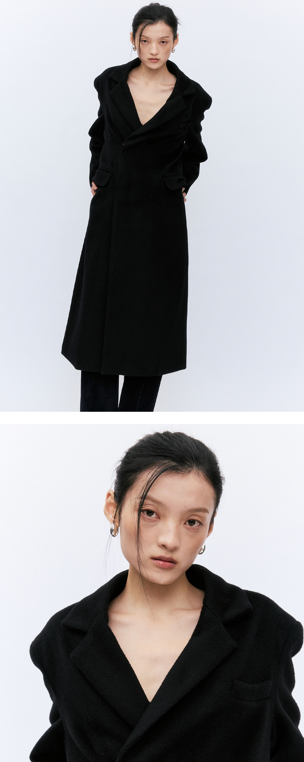 Merino Wool을 사용하였고 메리노 울은 호주에서 목초지가 잘 형성된 victoria주의 서부 및 남부에서 자라는 양입니다. 최고급 양모를 사용한 메리노 울은 세계적으로도 우수하고 소프트함이 특징이며 유지만의 시그니처 디자인이 돋보이는 버진 울 코트입니다. 에센셜한 라인으로 소재감또한 인조모와는 달리 볼륨감이 쉽게 무너지지 않고 가볍게 있으실수 있는 소재입니다. 보이지않는 디테일과 히든 버튼 클로즈로 버튼을 채우지않고 오픈하여 입었을때와 색다른 무드로 다양하게 연출이 가능합니다. 미니멀하면서도 몸이 움직였을때의 흐름이 유연하게 떨어지는 핏으로 포근하고 부드러운 텍스처입니다. 입으셨을때 편안하면서도 여유로운 실루엣으로 고급스러운 무드를 느낄수 있습니다. 어깨라인의 우아하면서도 유연하게 흐르는 디자인이며 어딘가 모르게 중성적이기도 한 매력적인 코트입니다. 아웃라인의 하단으로 내려갈수록 사선컷팅의 디테일을 주었습니다. 미니멀하면서도 어느룩에도 웨어러블하게 착용하실수 있는 아이템입니다.