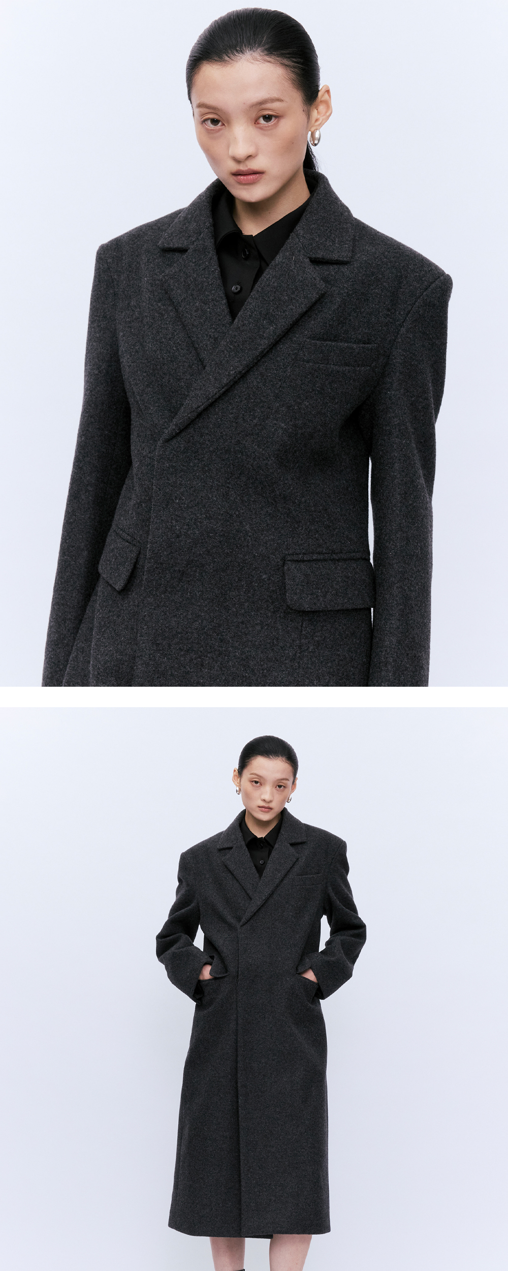 Merino Wool을 사용하였고 메리노 울은 호주에서 목초지가 잘 형성된 victoria주의 서부 및 남부에서 자라는 양입니다. 최고급 양모를 사용한 메리노 울은 세계적으로도 우수하고 소프트함이 특징이며 유지만의 시그니처 디자인이 돋보이는 버진 울 코트입니다. 에센셜한 라인으로 소재감또한 인조모와는 달리 볼륨감이 쉽게 무너지지 않고 가볍게 있으실수 있는 소재입니다. 보이지않는 디테일과 히든 버튼 클로즈로 버튼을 채우지않고 오픈하여 입었을때와 색다른 무드로 다양하게 연출이 가능합니다. 미니멀하면서도 몸이 움직였을때의 흐름이 유연하게 떨어지는 핏으로 포근하고 부드러운 텍스처입니다. 입으셨을때 편안하면서도 여유로운 실루엣으로 고급스러운 무드를 느낄수 있습니다. 어깨라인의 우아하면서도 유연하게 흐르는 디자인이며 어딘가 모르게 중성적이기도 한 매력적인 코트입니다. 아웃라인의 하단으로 내려갈수록 사선컷팅의 디테일을 주었습니다. 미니멀하면서도 어느룩에도 웨어러블하게 착용하실수 있는 아이템입니다.