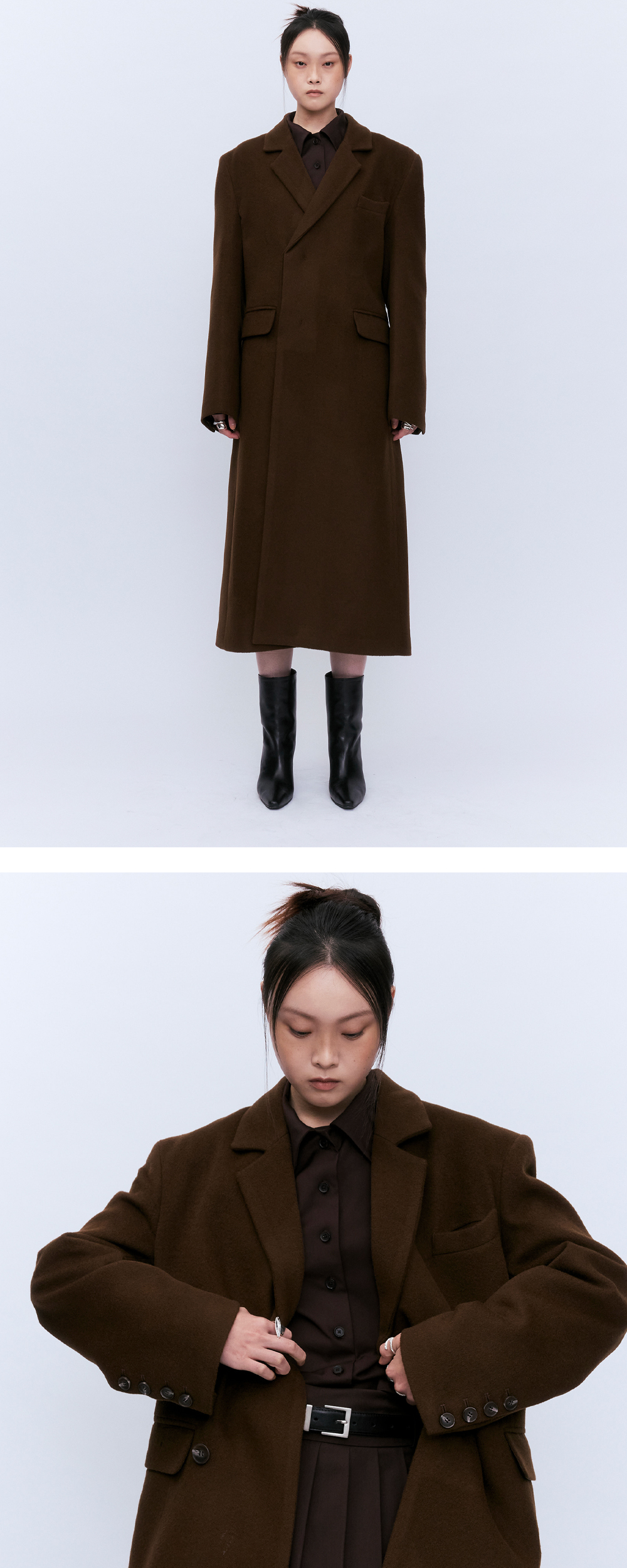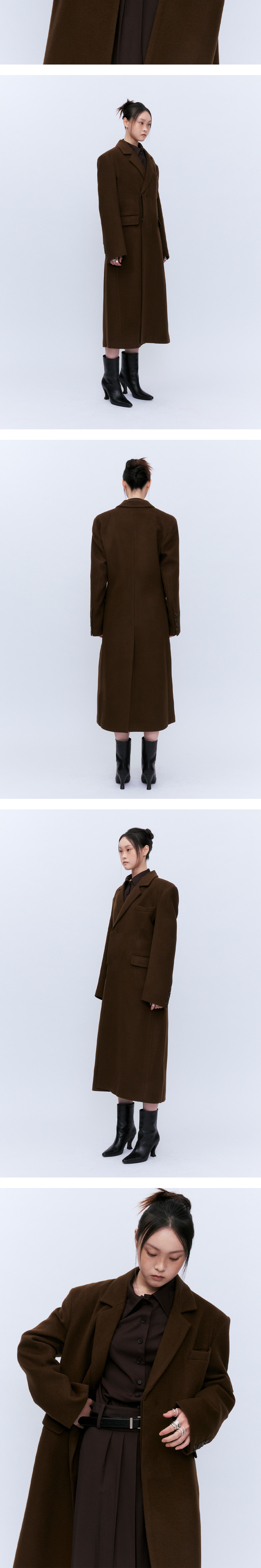 Merino Wool을 사용하였고 메리노 울은 호주에서 목초지가 잘 형성된 victoria주의 서부 및 남부에서 자라는 양입니다. 최고급 양모를 사용한 메리노 울은 세계적으로도 우수하고 소프트함이 특징이며 유지만의 시그니처 디자인이 돋보이는 버진 울 코트입니다. 에센셜한 라인으로 소재감또한 인조모와는 달리 볼륨감이 쉽게 무너지지 않고 가볍게 있으실수 있는 소재입니다. 보이지않는 디테일과 히든 버튼 클로즈로 버튼을 채우지않고 오픈하여 입었을때와 색다른 무드로 다양하게 연출이 가능합니다. 미니멀하면서도 몸이 움직였을때의 흐름이 유연하게 떨어지는 핏으로 포근하고 부드러운 텍스처입니다. 입으셨을때 편안하면서도 여유로운 실루엣으로 고급스러운 무드를 느낄수 있습니다. 어깨라인의 우아하면서도 유연하게 흐르는 디자인이며 어딘가 모르게 중성적이기도 한 매력적인 코트입니다. 아웃라인의 하단으로 내려갈수록 사선컷팅의 디테일을 주었습니다. 미니멀하면서도 어느룩에도 웨어러블하게 착용하실수 있는 아이템입니다.