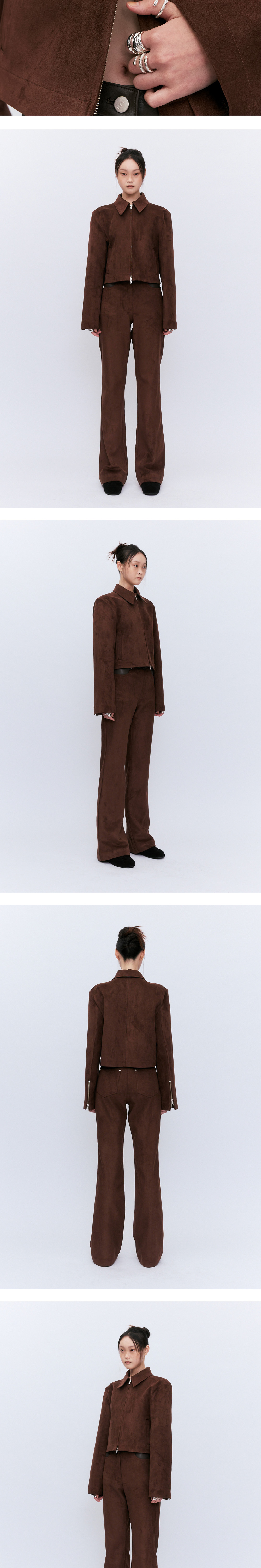 고급스러운 스웨이드 소재를 사용하여 미니멀하면서도 몸의 발란스를 잡아주는 디자인입니다. 스웨이드 펜츠와 셋업으로 구성하였으며 펜츠와 함께 셋업으로 착용하였을때 매력의 극대화를 느끼실수 있습니다. 이너또한 비건레더로 구성하여 보이지 않는 곳까지 디테일을 느끼실수 있습니다. 투웨이 ykk지퍼로 때에따라 웨어러블하게 다양한 연출을 하실수 있습니다.
