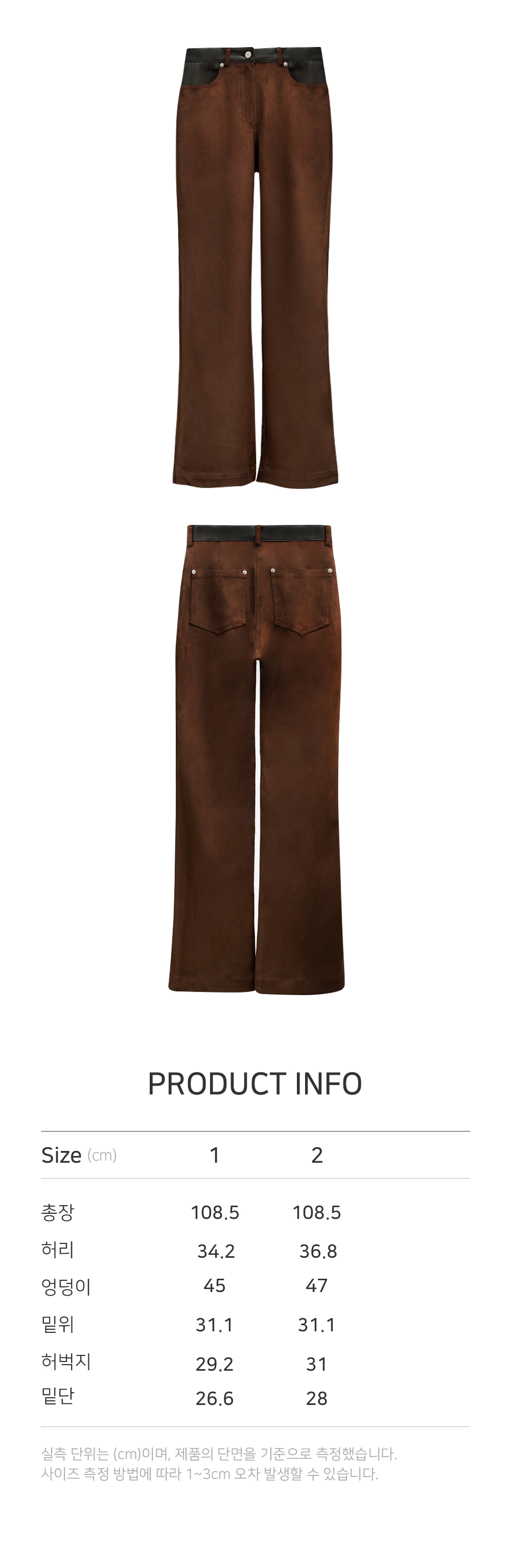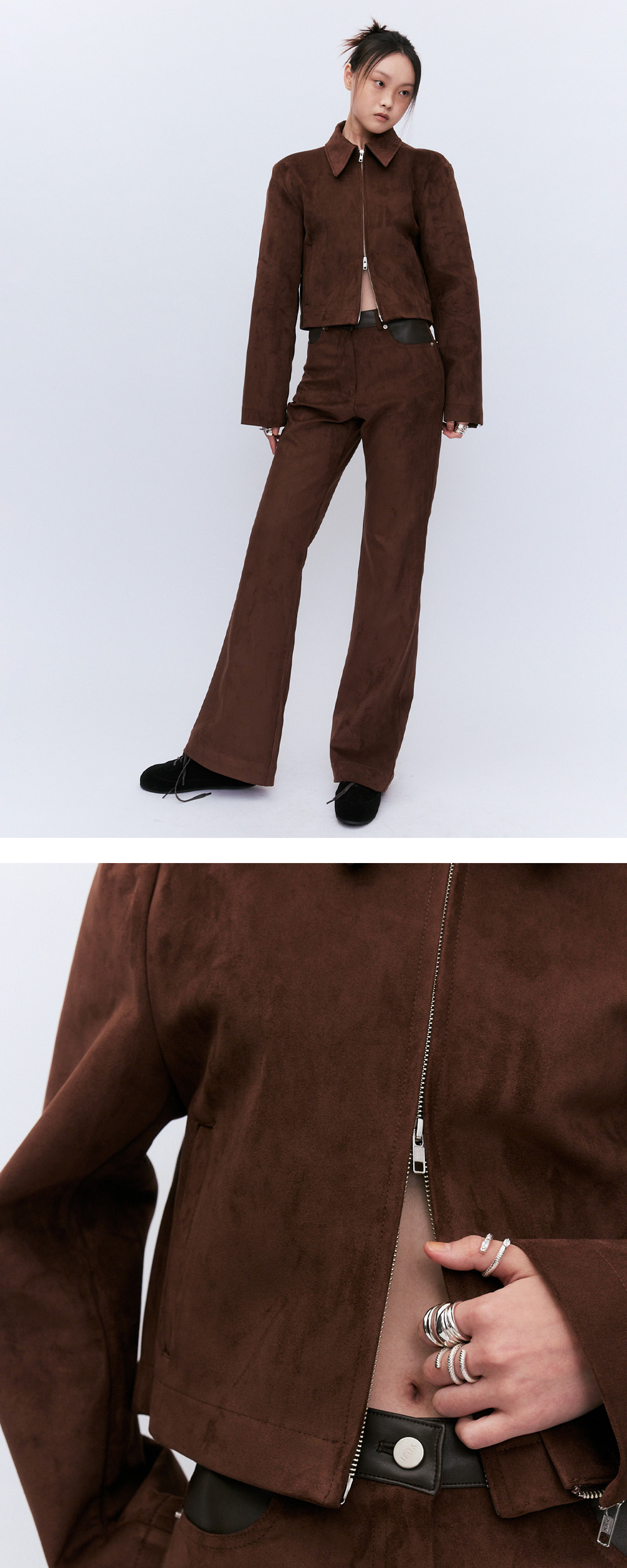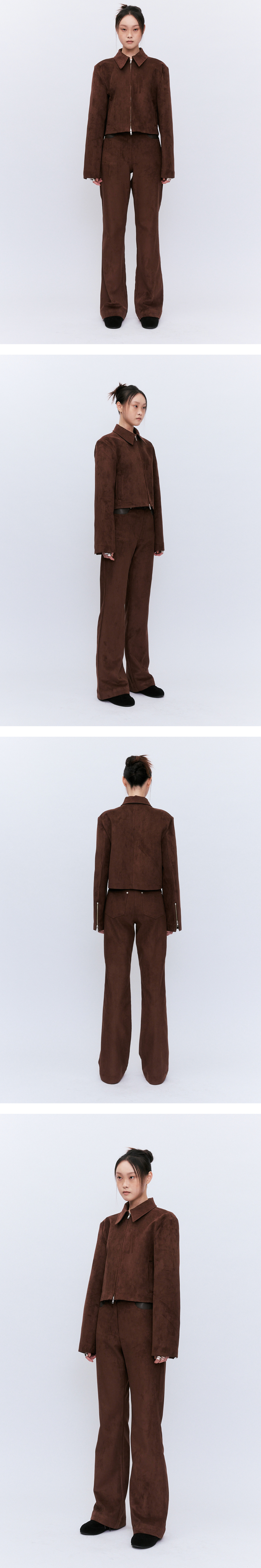 고급스러우면서도 부드러운 스웨이드 소재를 사용하여 보온성또한 우수합니다. 자연스러운 패턴으로 몸에맞게 흐르면서 딱 떨어지는 핏으로 유행을 타지 않는 디자인입니다. 무릎부터 자연스럽고 유연하게 떨어지는 핏이며 다리가 길어보입니다. 스웨이드자켓과 셋업으로 디자인하였습니다 펜츠양쪽 포켓에 비건레더의 디테일을 추가하여 유니크함이 돋보입니다. 셋업으로 혹은 따로 펜츠로만 연출하여도 어느룩에도 어울릴수 있는 포인트가 될수있는 스웨이드 셋업 펜츠입니다.