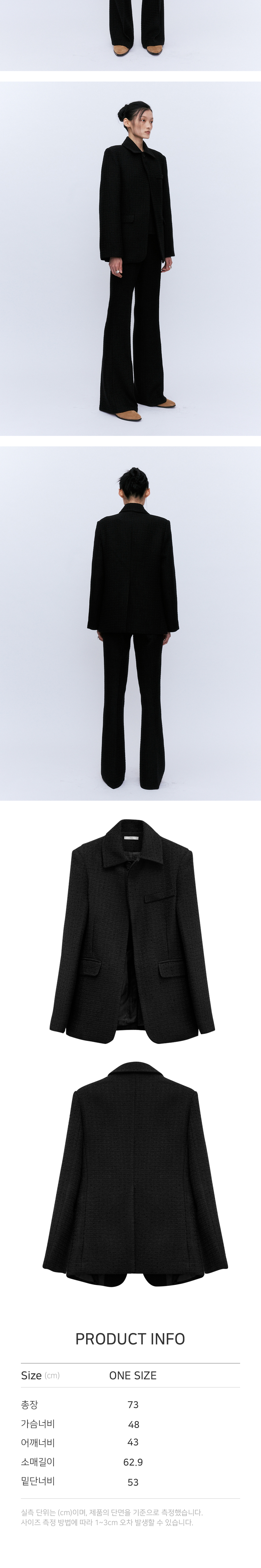 특수원단의 트웨이드 소재를 사용하여 디자인하였습니다. 원버튼의 포인트로 오픈했을때는 캐주얼하며 단추를 채우면 또다른 분위기를 연출할수 있습니다. 기존의 트웨이드 자켓과 다른 현대적이며 웨어러블한 구성으로 디자인하였습니다. 고급스러운 무드의 디자인으로 청바지나 진에도 잘 어울리며 트웨이드 펜츠와 함께 셋업으로 입었을때 드레스업 되는 디자인입니다.