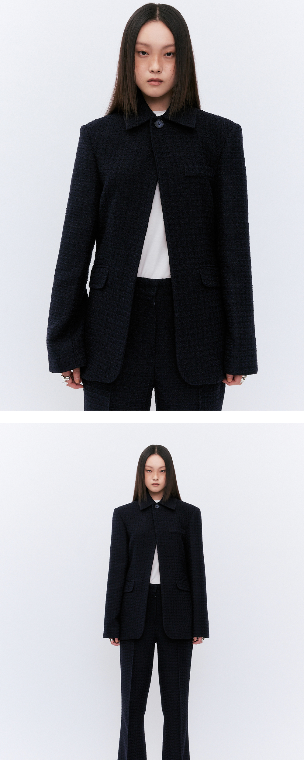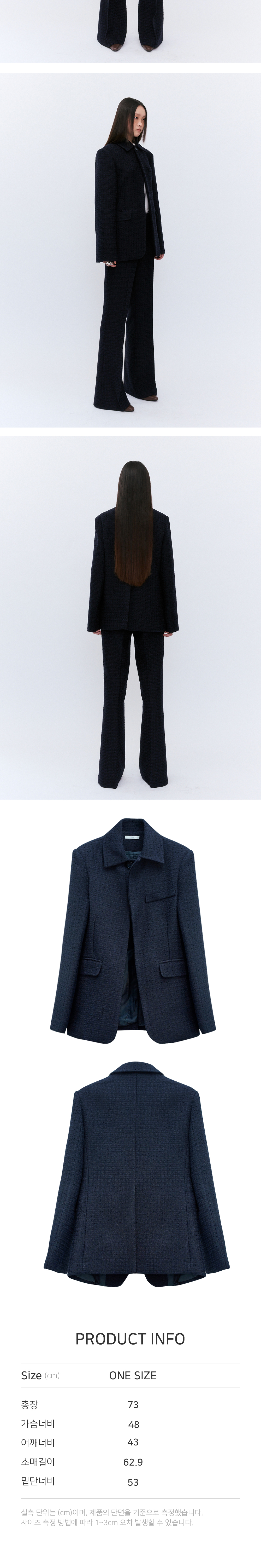 특수원단의 트웨이드 소재를 사용하여 디자인하였습니다. 원버튼의 포인트로 오픈했을때는 캐주얼하며 단추를 채우면 또다른 분위기를 연출할수 있습니다. 기존의 트웨이드 자켓과 다른 현대적이며 웨어러블한 구성으로 디자인하였습니다. 고급스러운 무드의 디자인으로 청바지나 진에도 잘 어울리며 트웨이드 펜츠와 함께 셋업으로 입었을때 드레스업 되는 디자인입니다.