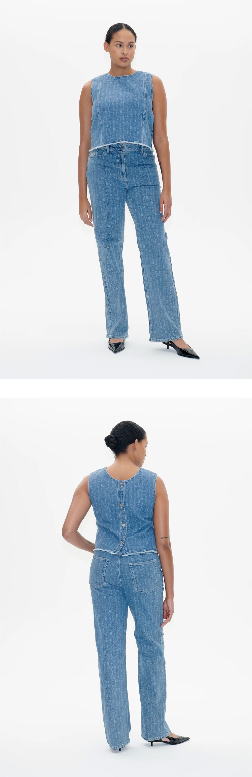 데님의 해진 밑단 디테일이 매력적인 바움 운드 페르드가르텐의 마딘 데님 블루 슬리브리스입니다. - 크롭 기장의 슬리브리스 데님 탑 - 뒷판 큰 단추 여밈과 해진 밑단 디테일 - 레귤러 핏