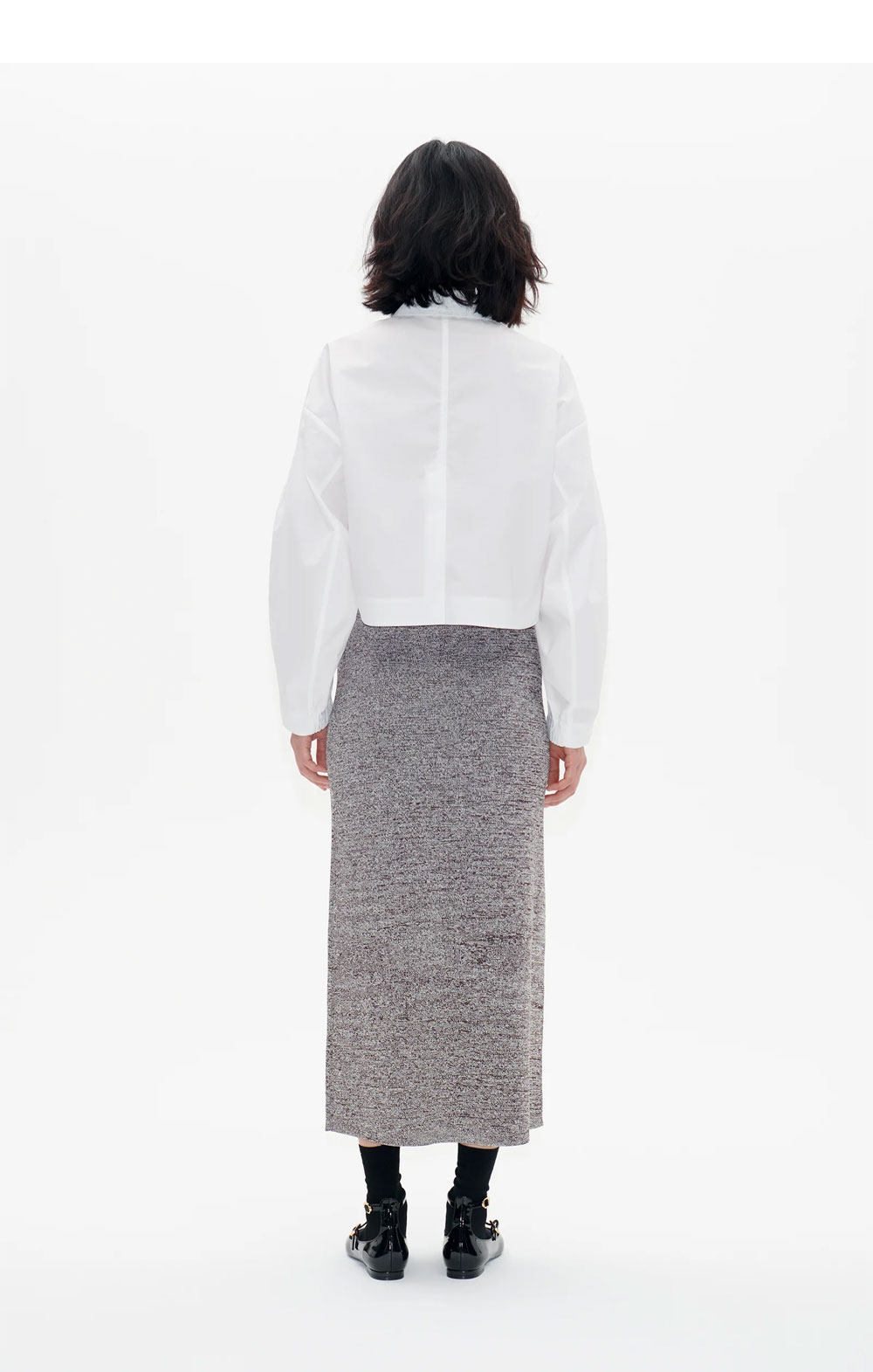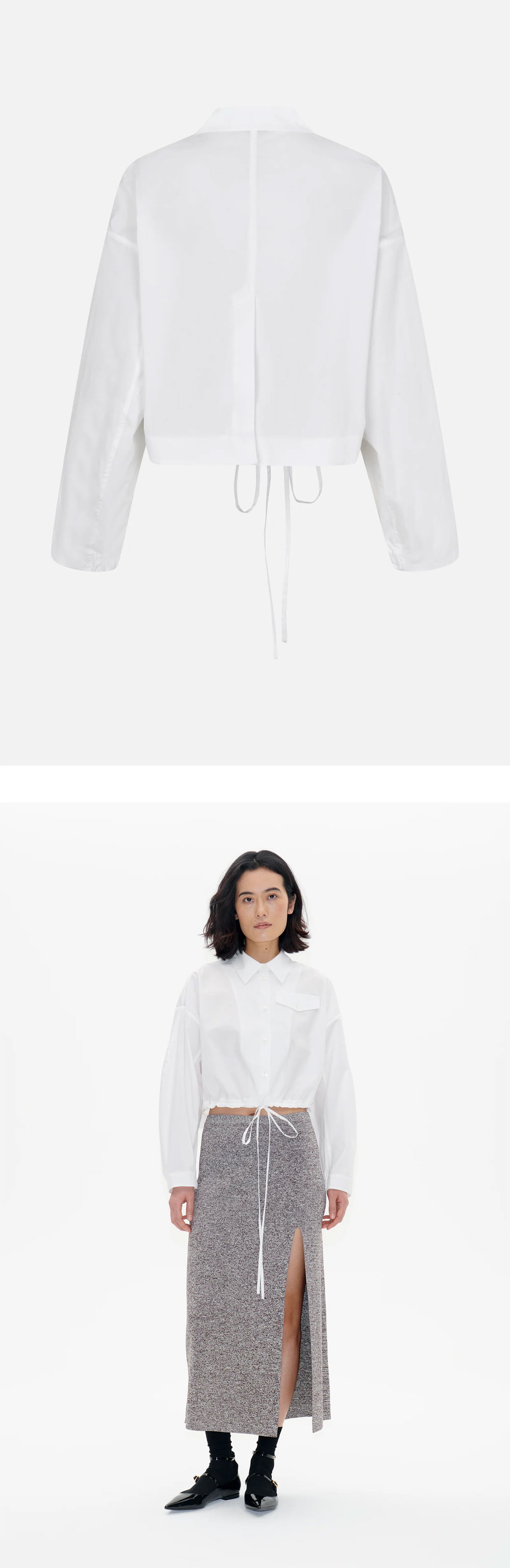스트링으로 실루엣 조절이 가능한 바움 운드 페르드가르텐의 브라이스 브라이트 화이트 셔츠입니다. - 오버사이즈드 핏 - 크롭 버튼 업 셔츠 디자인 - 전면 드로우 스트링 디테일 - 신축성있는 소매