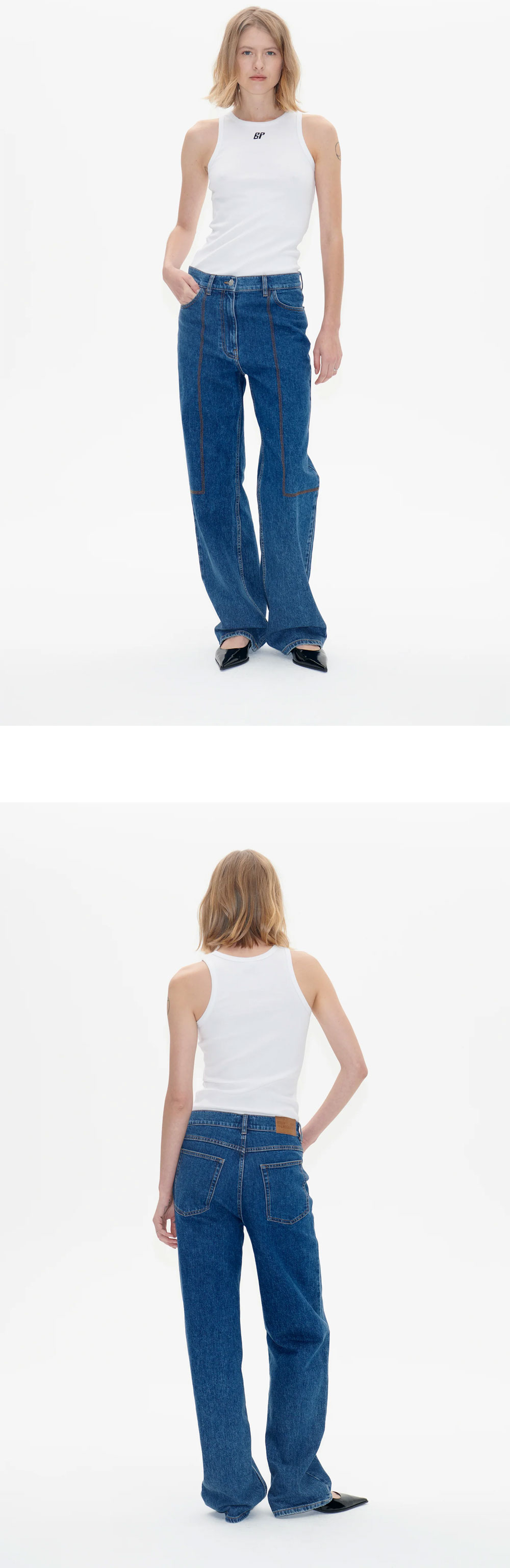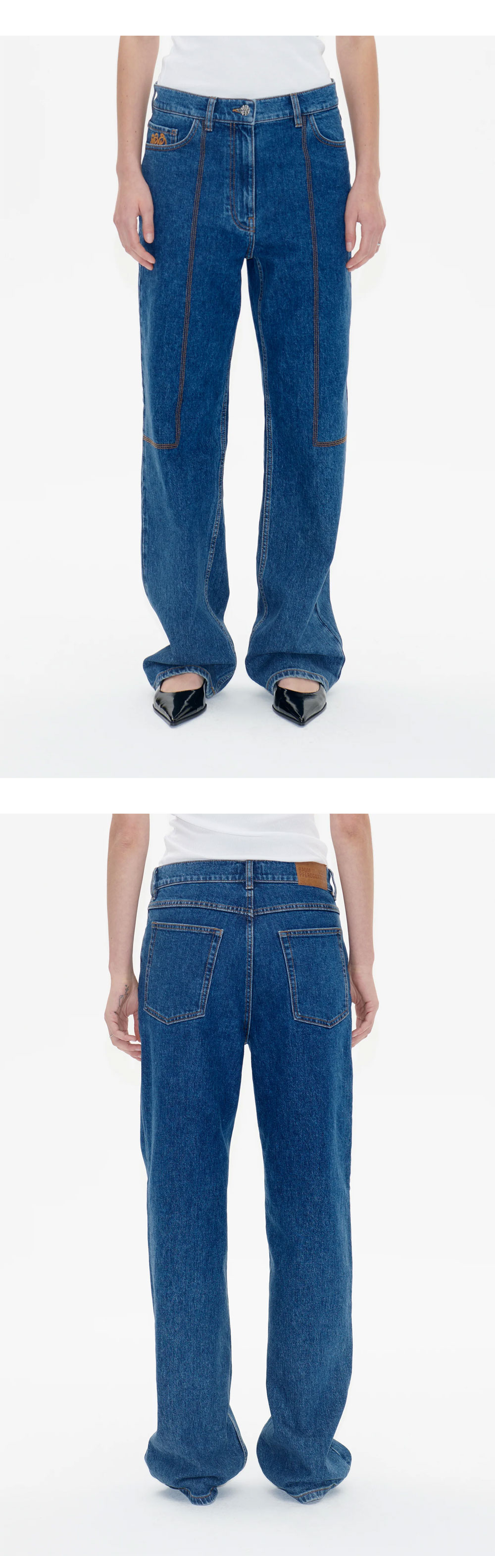 기장이 길고 스트레이트 핏으로 다리가 길어보이는 바움 운드 페르드가르텐의 닐다 클래식 블루 데님 팬츠입니다. - 미드라이즈 진 - 레귤러 핏 - 딱 맞는 엉덩이 핏 - 드롭 크로치