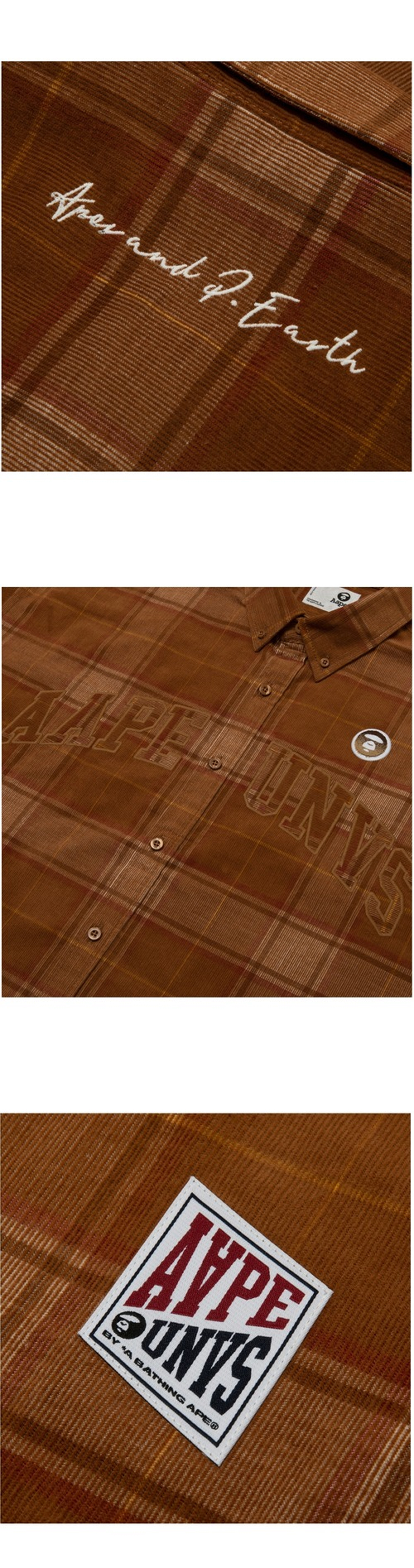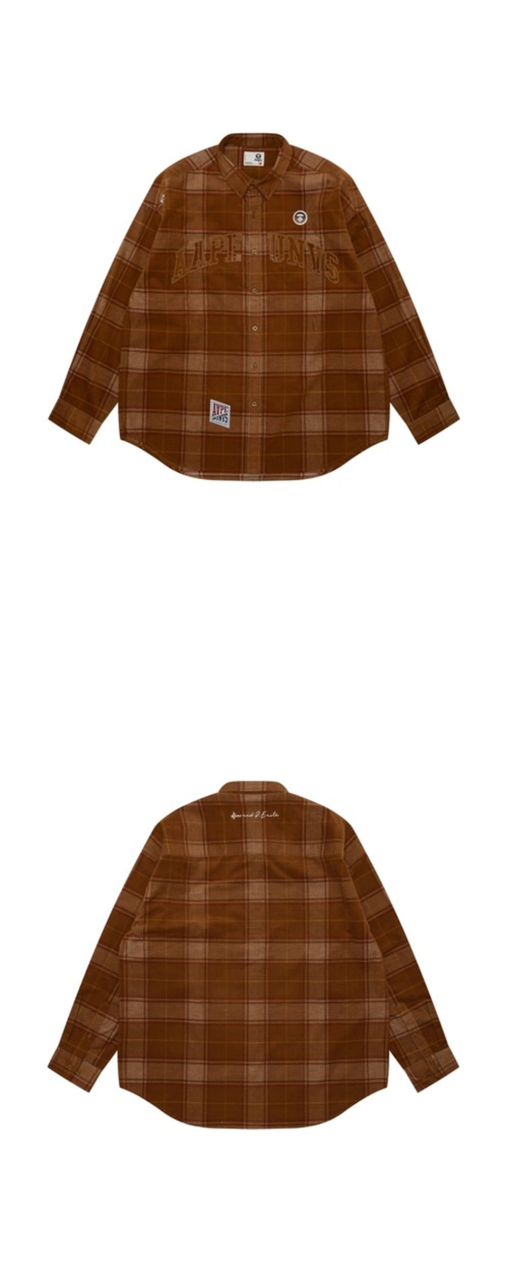 코듀로이 소재와 체크 패턴이 포근한 느낌을 주는 에이프의 롱슬리브 셔츠입니다. - 오버사이즈 핏 - 체크 패턴이 적용된 코듀로이 원단 - 전면 로고 자수 및 패치 - 후면 로고 자수 디테일