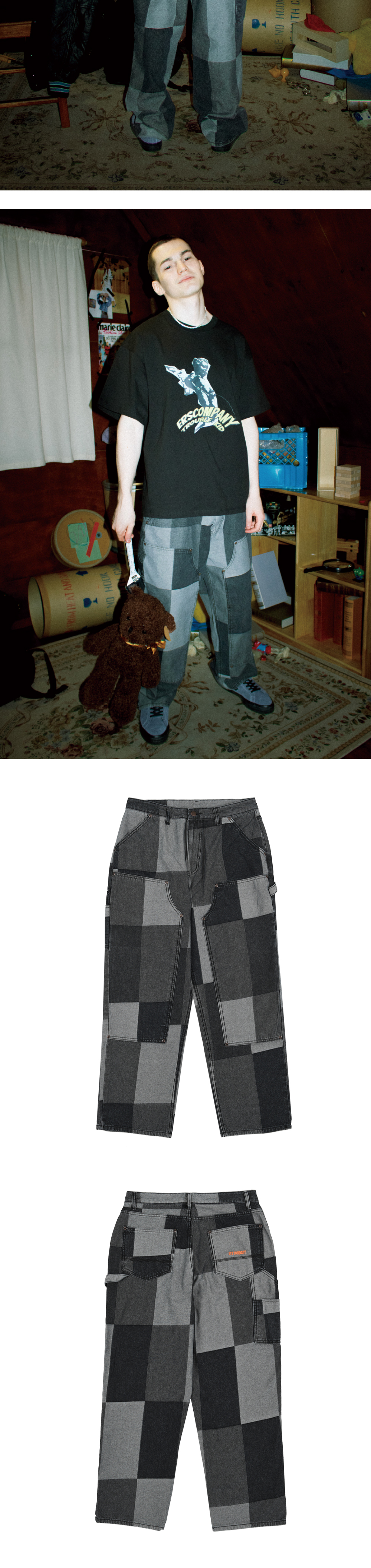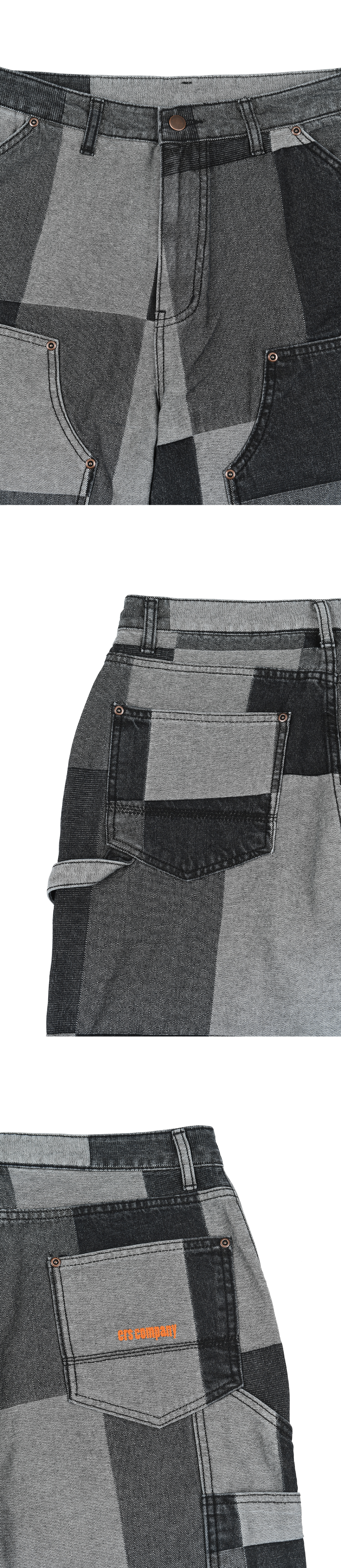 이알에스코 자카드 패치워크 더블 니 팬츠 블랙