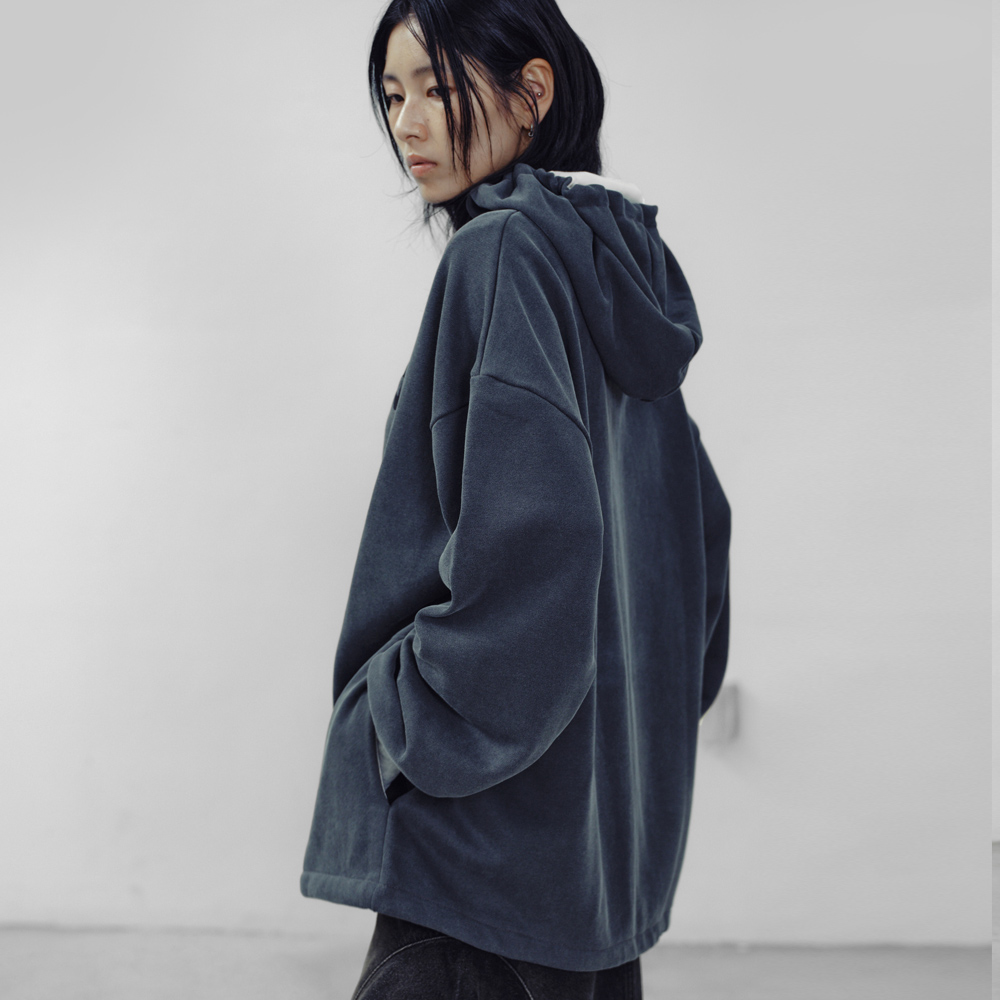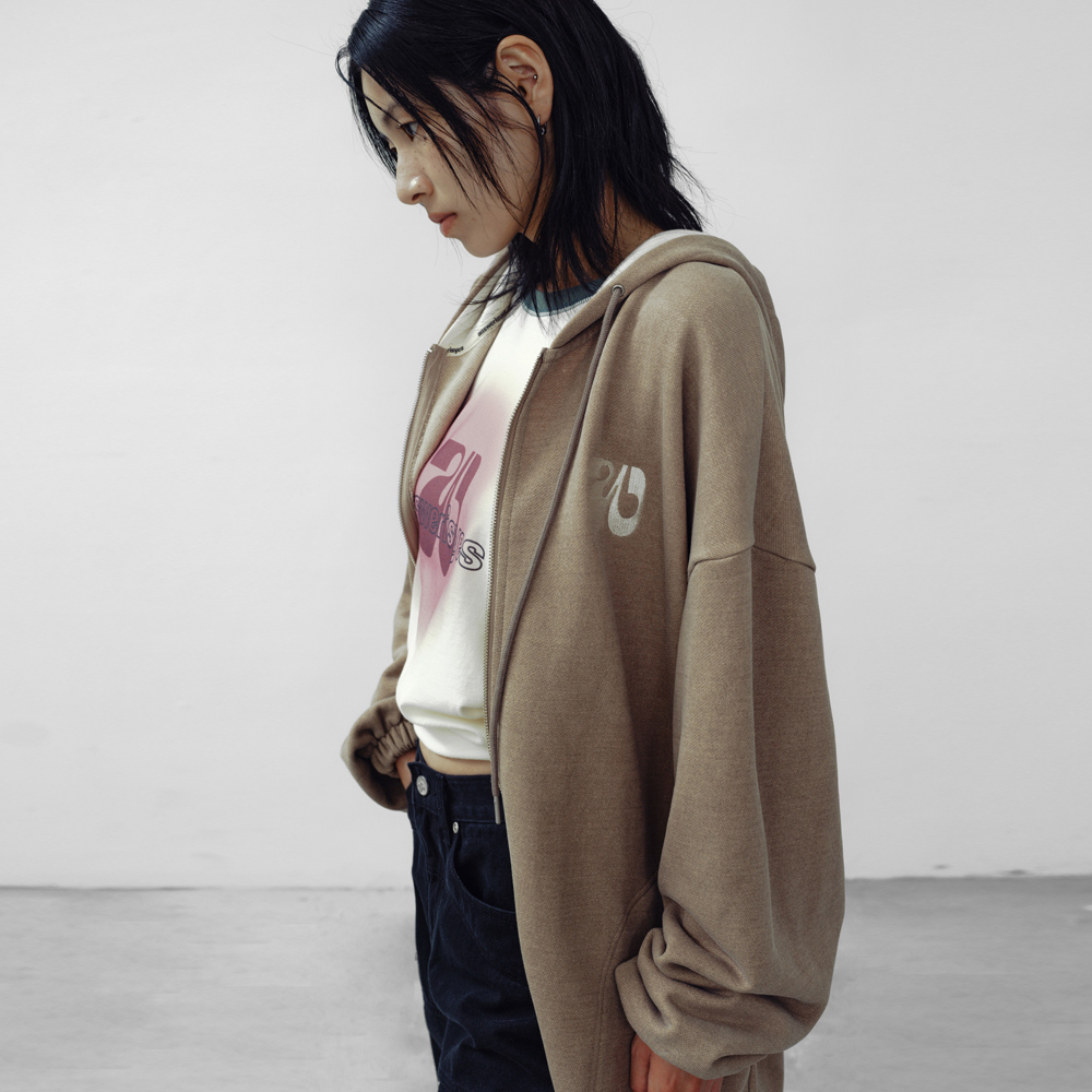 피그먼트 워싱을 거쳐 네추럴한 컬러감의 후드집업 오버사이즈 디자인으로 캐주얼한 무드 후드 안감의 배색 디자인 앞면 견고한 로고 자수 디테일 밑단 스트링을 이용해 핏 조절 가능