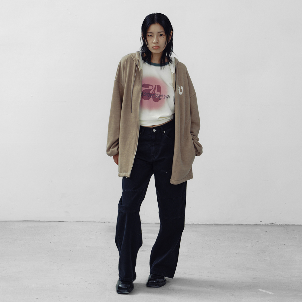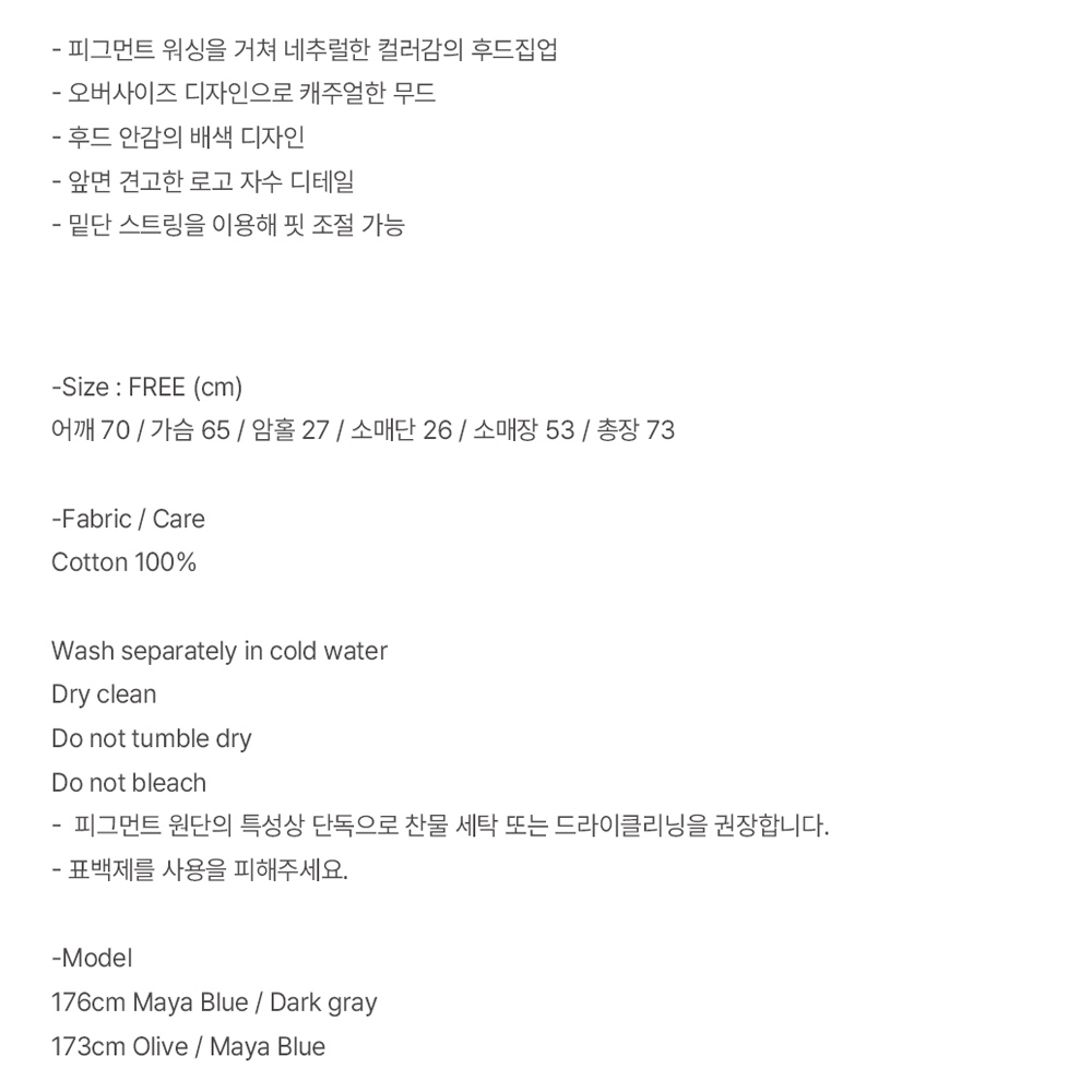 피그먼트 워싱을 거쳐 네추럴한 컬러감의 후드집업 오버사이즈 디자인으로 캐주얼한 무드 후드 안감의 배색 디자인 앞면 견고한 로고 자수 디테일 밑단 스트링을 이용해 핏 조절 가능