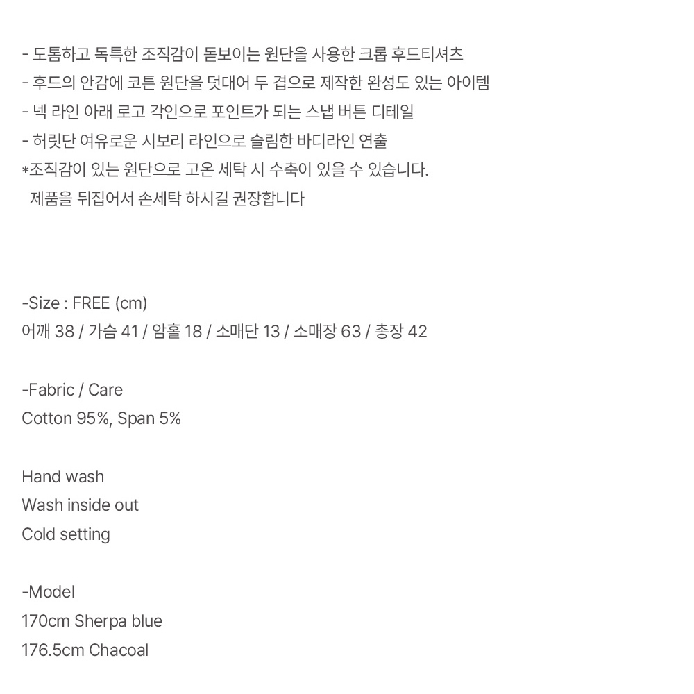 도톰하고 독특한 조직감이 돋보이는 원단을 사용한 크롭 후드티셔츠 후드의 안감에 코튼 원단을 덧대어 두 겹으로 제작한 완성도 있는 아이템 넥 라인 아래 로고 각인으로 포인트가 되는 스냅 버튼 디테일 허릿단 여유로운 시보리 라인으로 슬림한 바디라인 연출 * 조직감이 있는 원단으로 고온 세탁 시 수축이 있을 수 있습니다. 제품을 뒤집어서 손세탁 하시길 권장합니다.
