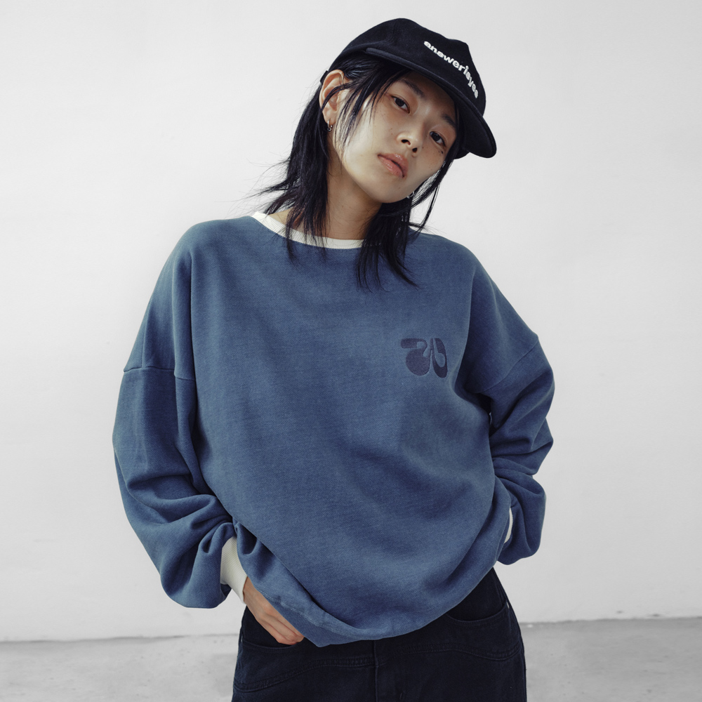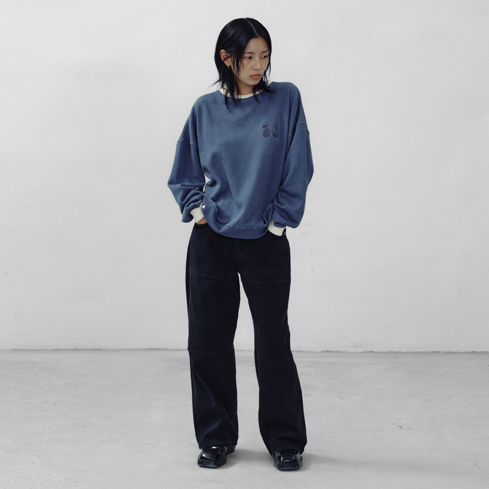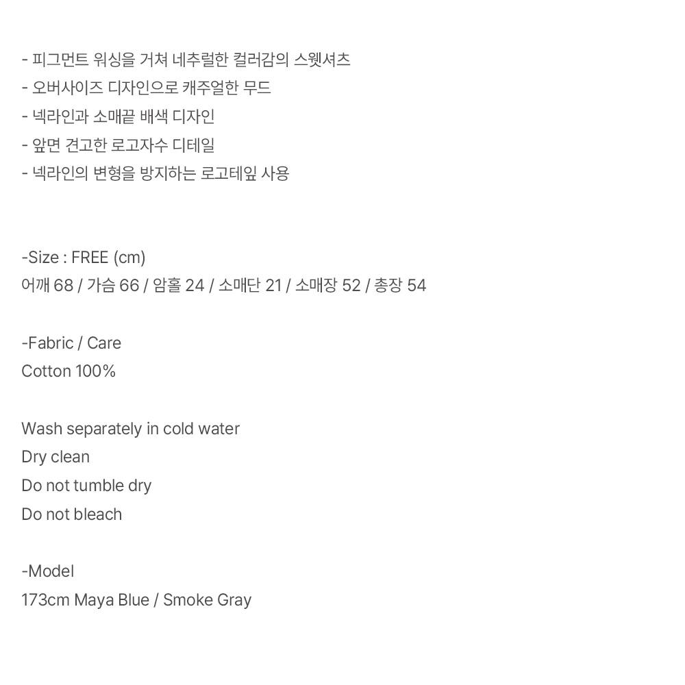 피그먼트 워싱을 거쳐 네추럴한 컬러감의 스웻셔츠 오버사이즈 디자인으로 캐주얼한 무드 넥라인과 소매끝 배색 디자인 앞면 견고한 로고자수 디테일 넥라인의 변형을 방지하는 로고테잎 사용