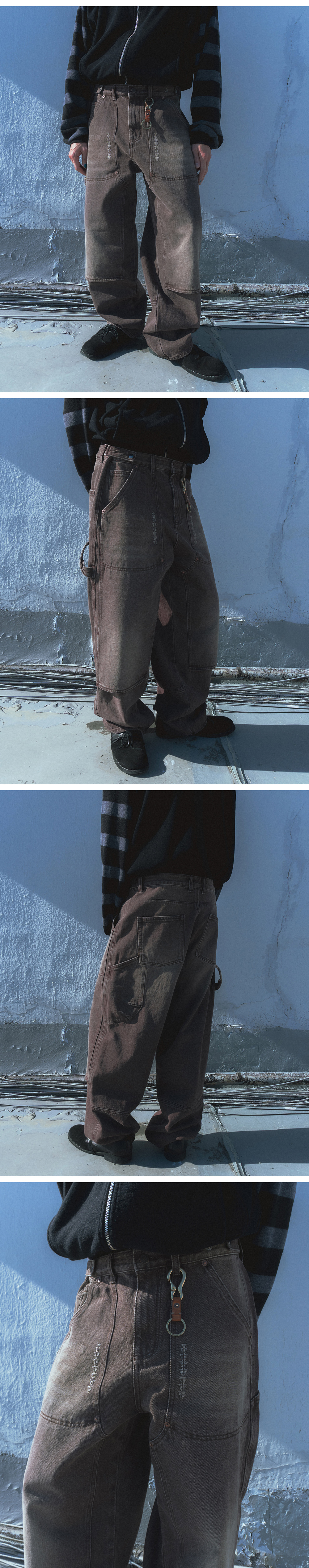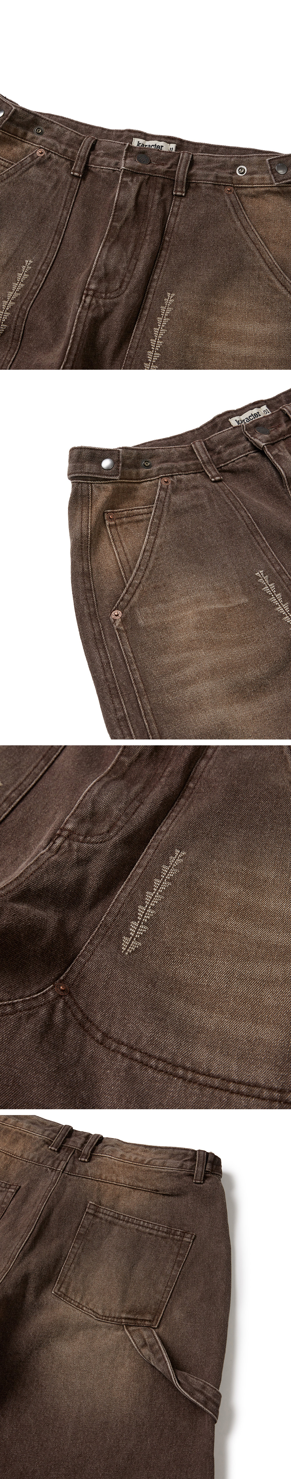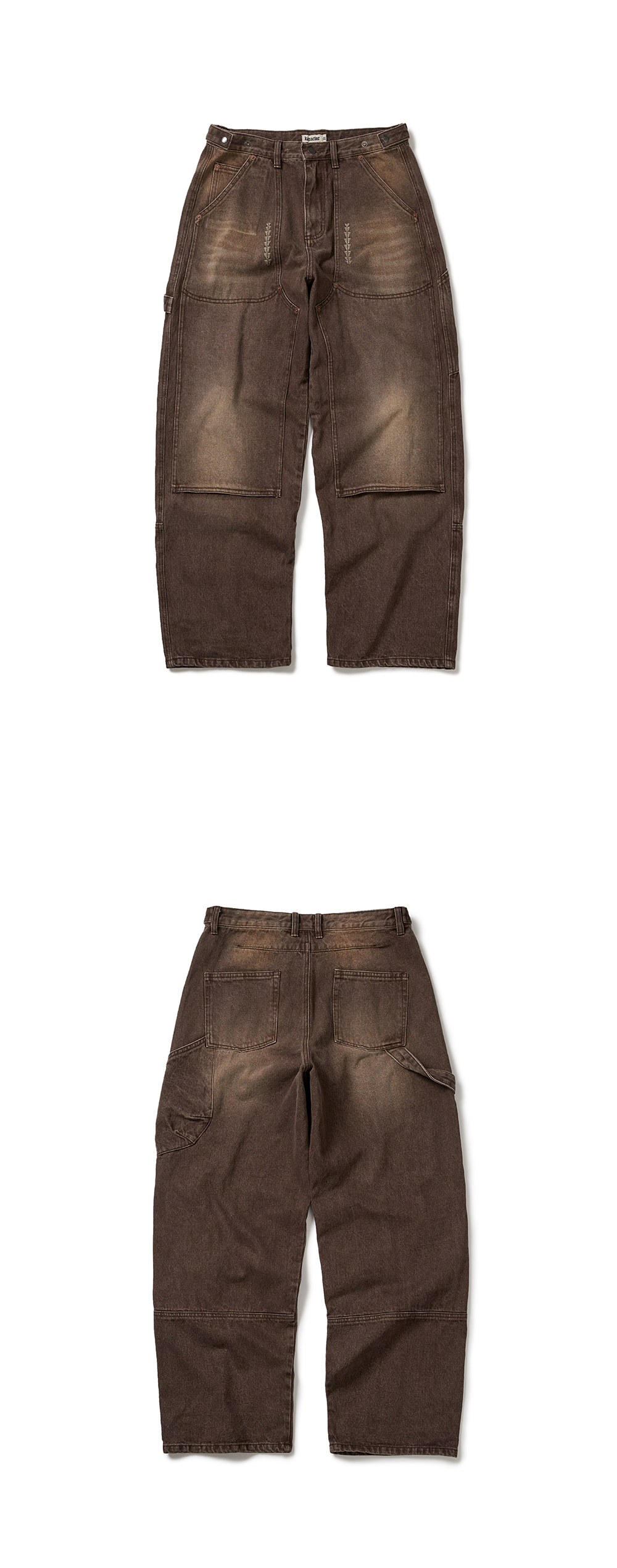 Product Info. - 탄탄한 밀도와 적당한 고시감의 13oz 브라운 데님 원단 - 넉넉하게 떨어지는 실루엣의 와이드 핏 더블 니 데님 팬츠 - 거칠고 대조적인 페이딩 처리로 빈티지한 느낌의 워싱 - 프런트 웨스턴 무드 패턴 자수 포인트 - 허리 사이즈 조절 가능한 벨트라인 양 사이드 버튼 어드저스터 - 후면 다트를 활용한 입체 구조의 엔지니어 포켓, 해머 루프 디테일 - 후면 상단 다트 요크, 하단 절개 디테일 - ykk 택버튼, ykk 리벳 사용