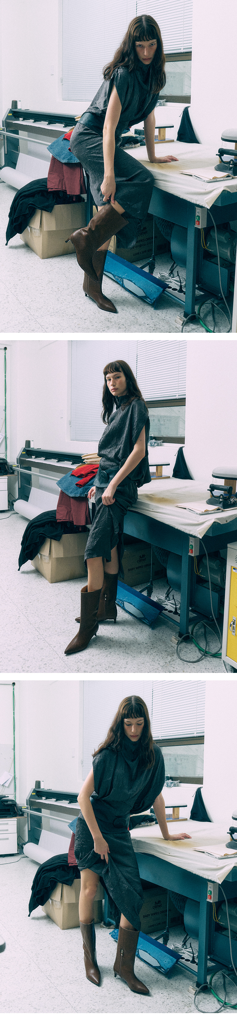 간결하고 스탠다드한 실루엣의 키튼힐 하프부츠, 와이드한 풀오버 스타일로 스커트, 팬츠 등 다양한 연출