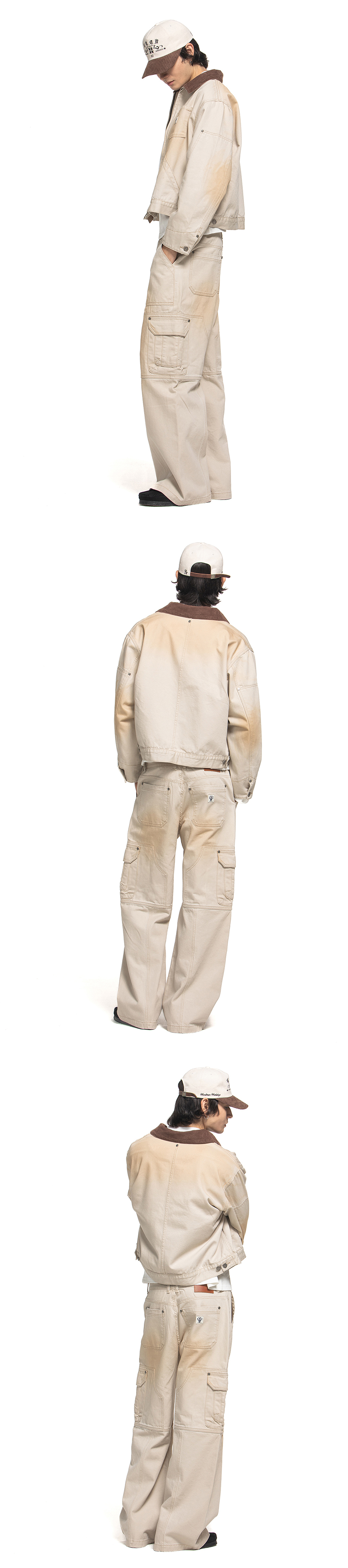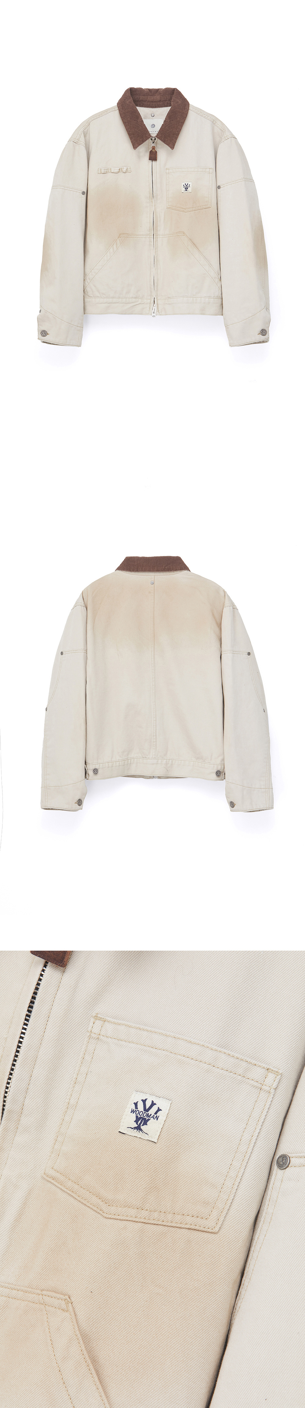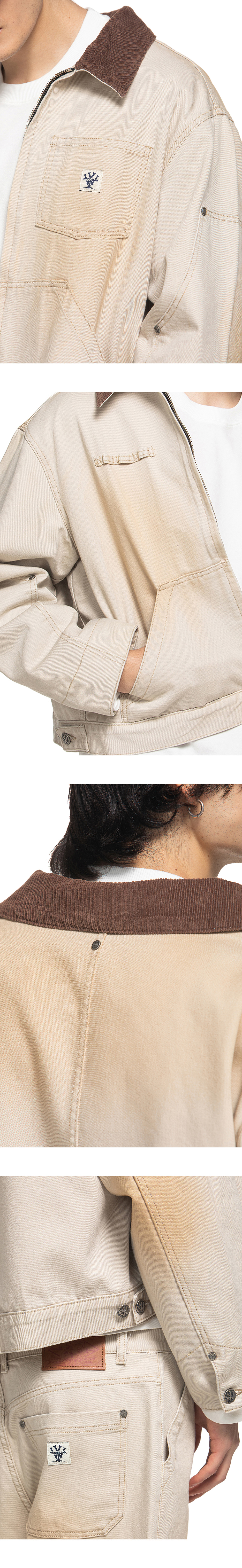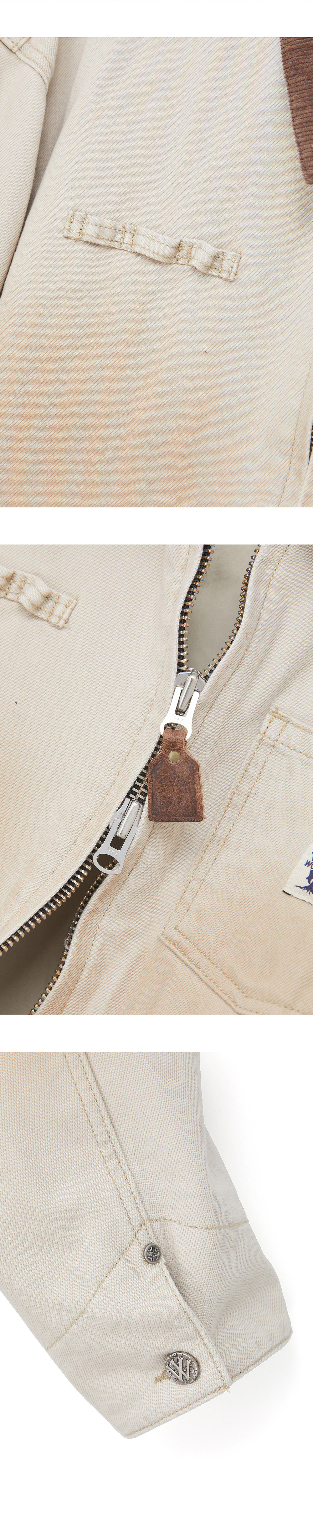 오일 워싱 기법과 피그먼트 워싱이 적용된 워크 자켓 입니다. 짧은 기장감과 빈티지한 감성, 그리고 트렌디한 감각을 중심으로 디자인 되었습니다. 소매에 더블니 팬츠에 들어가는 덧댐 디테일과 가슴에 아웃포켓과 팬꽂이 디테일이 디자인 되었습니다. - 가슴 아웃포켓 - 팬꽂이 디테일 - 소매 더블니 팬츠 디테일 - 8# YKK 투웨이 지퍼 - 소가죽 지퍼 풀러 - 우드먼 W 켄톤 - 우드먼 나이태 리벳 - 피그먼트 워싱 패브릭 - 오일 워싱